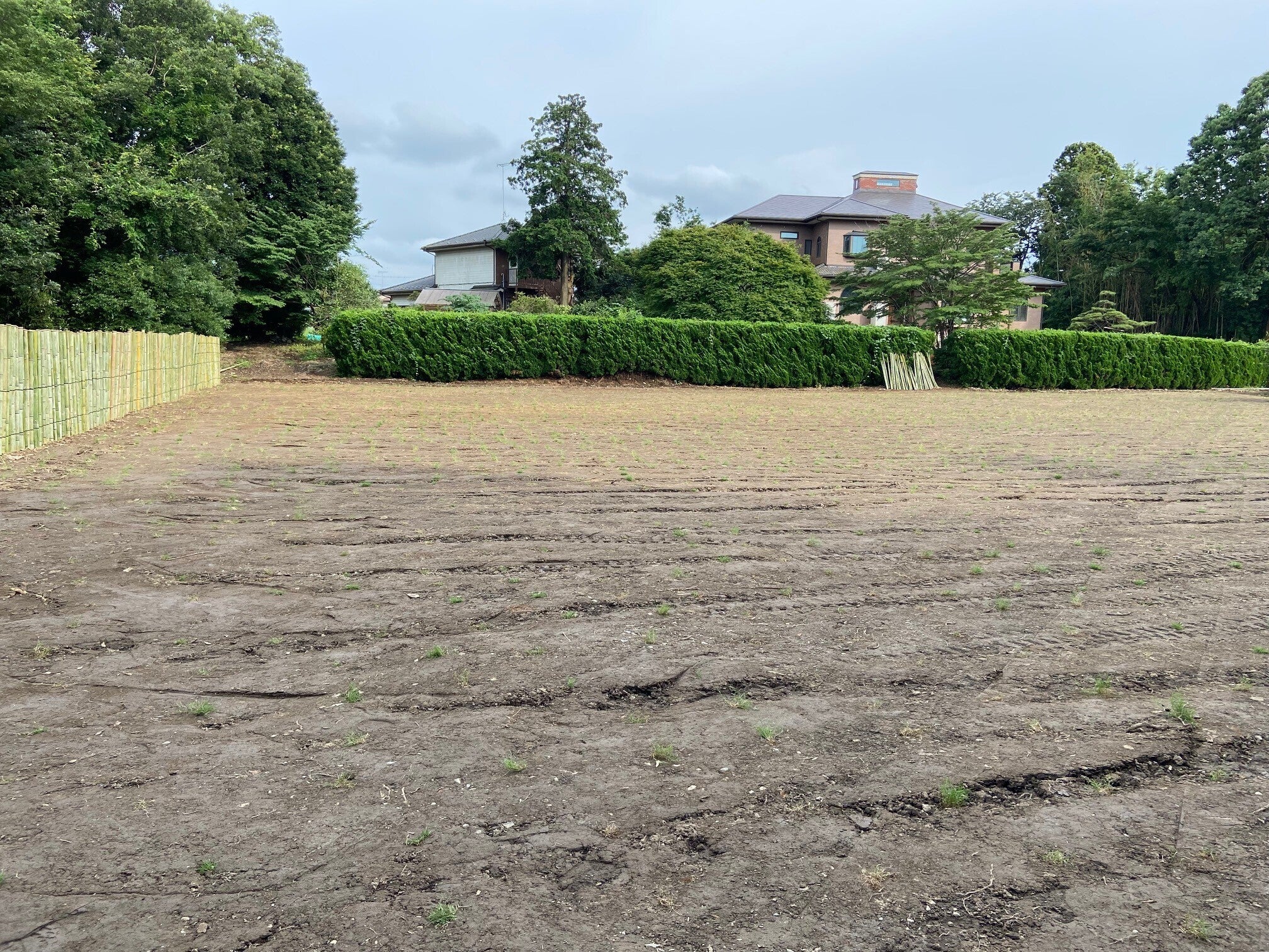 ハンドメイドですが、フェンスを作成中です。これが中々、大変ですが、頑張ってます。この仕事は家族と友人で頑張ってます。手前の芝も育ってきてます!