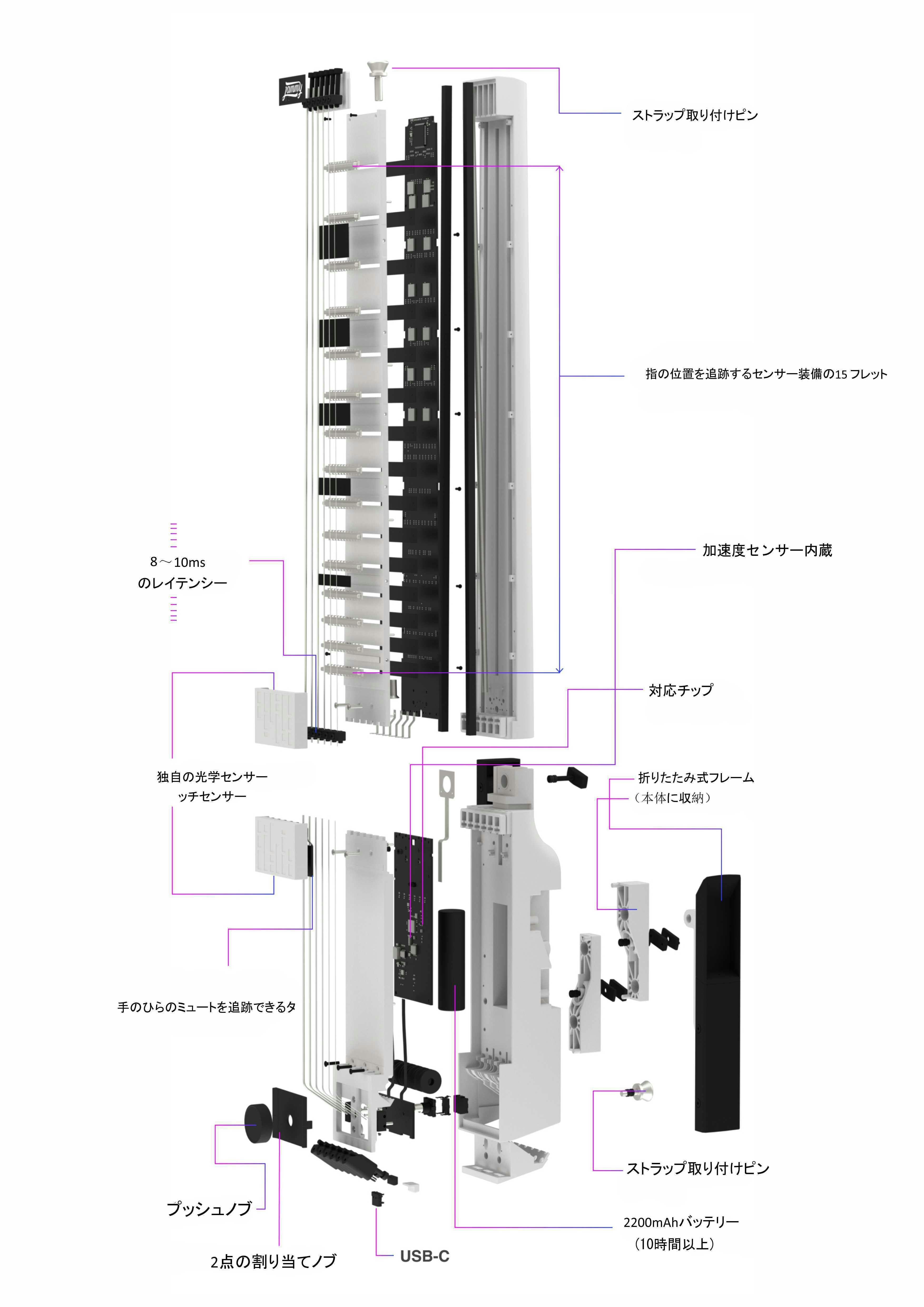 レイテンシーを減少させた独自の光学センサーの拡張バージョンと、左手と右手の動きを個別に追跡できる 2 ピース構造を採用。