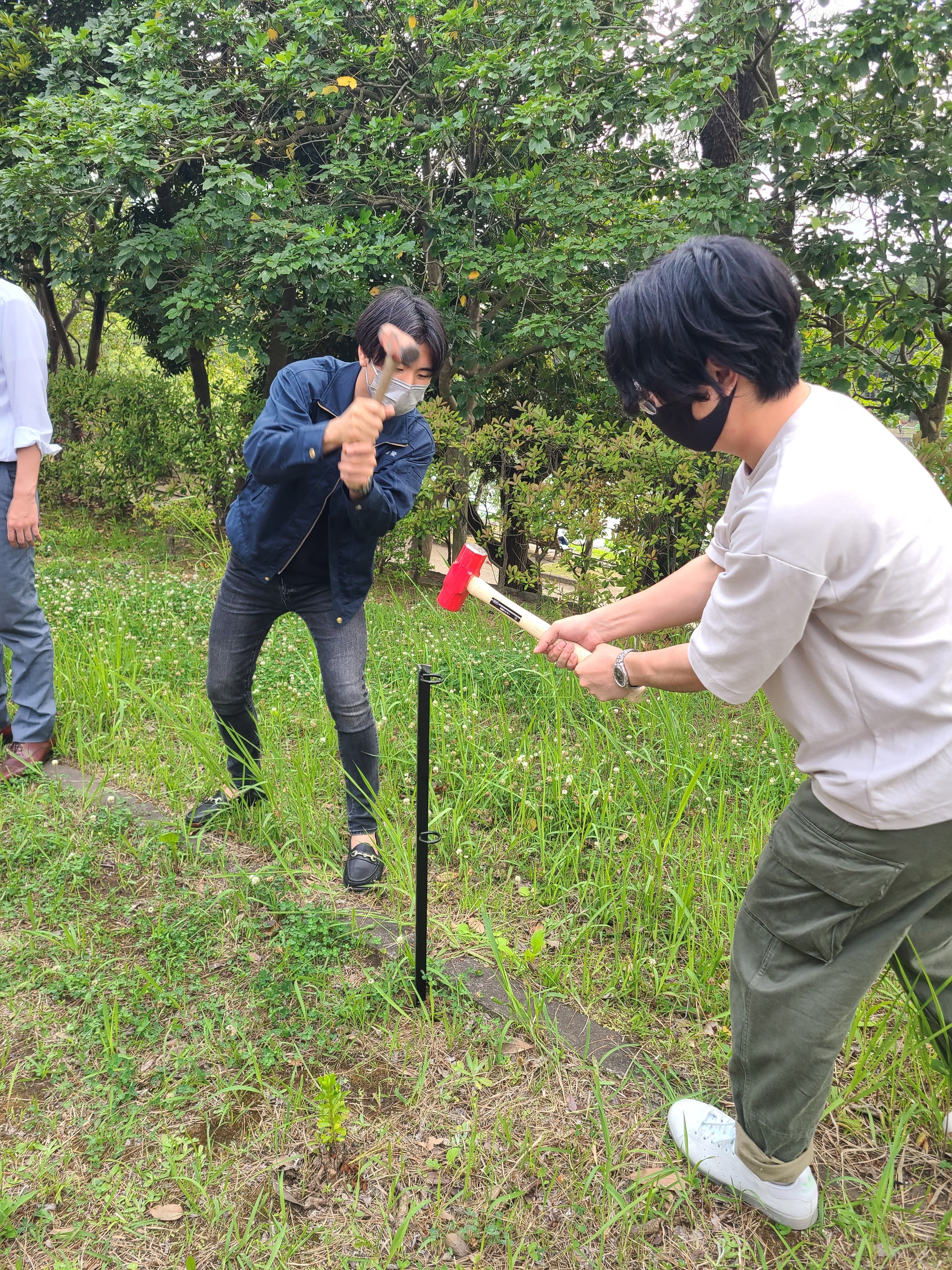 設置する場所に杭をガンガン打って、のぼりを組み立てて、設置・・・を、100本以上(笑)