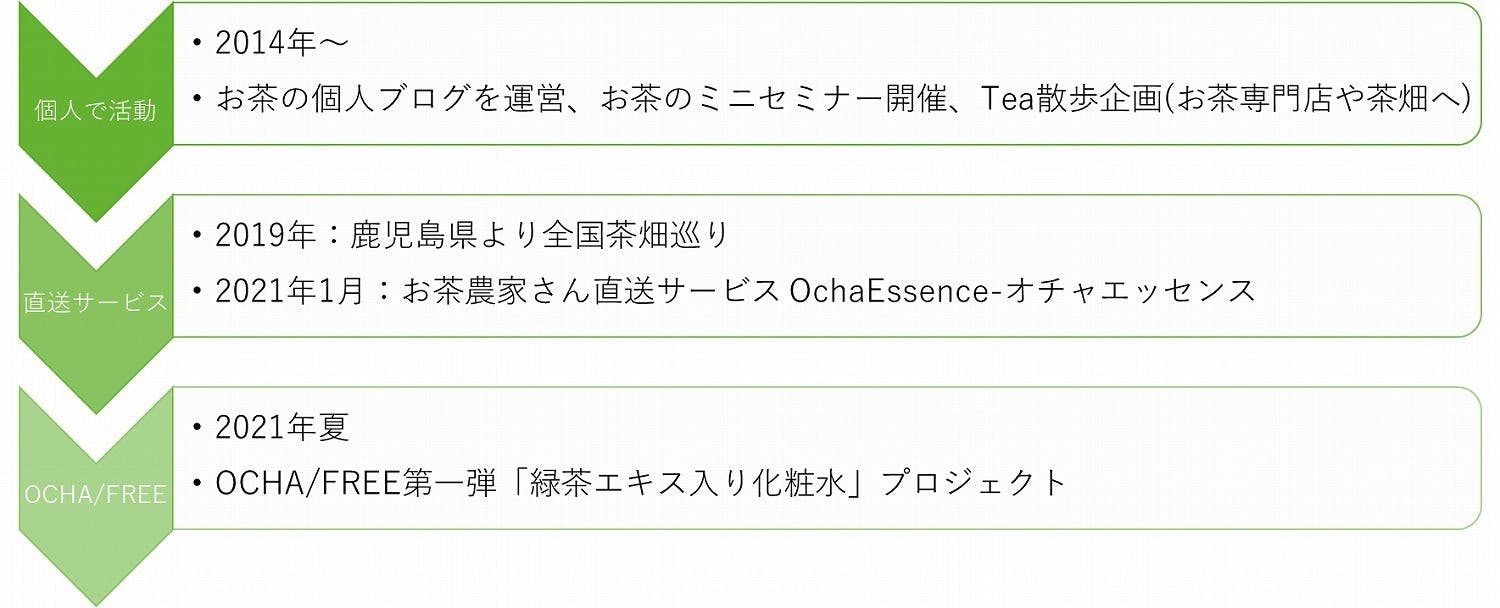 2019年1月に株式会社ワンズインを設立し、南は鹿児島から北は新潟・村上までの茶畑を巡りました。その後、お茶農家様直送のOchaEssence-オチャエッセンスというサービスを立上げ、現在に至ります。