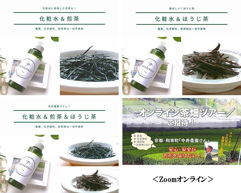 <右下>全部セット:化粧水1本:内容量100ml 、 お茶5種、オンライン茶畑ツアー