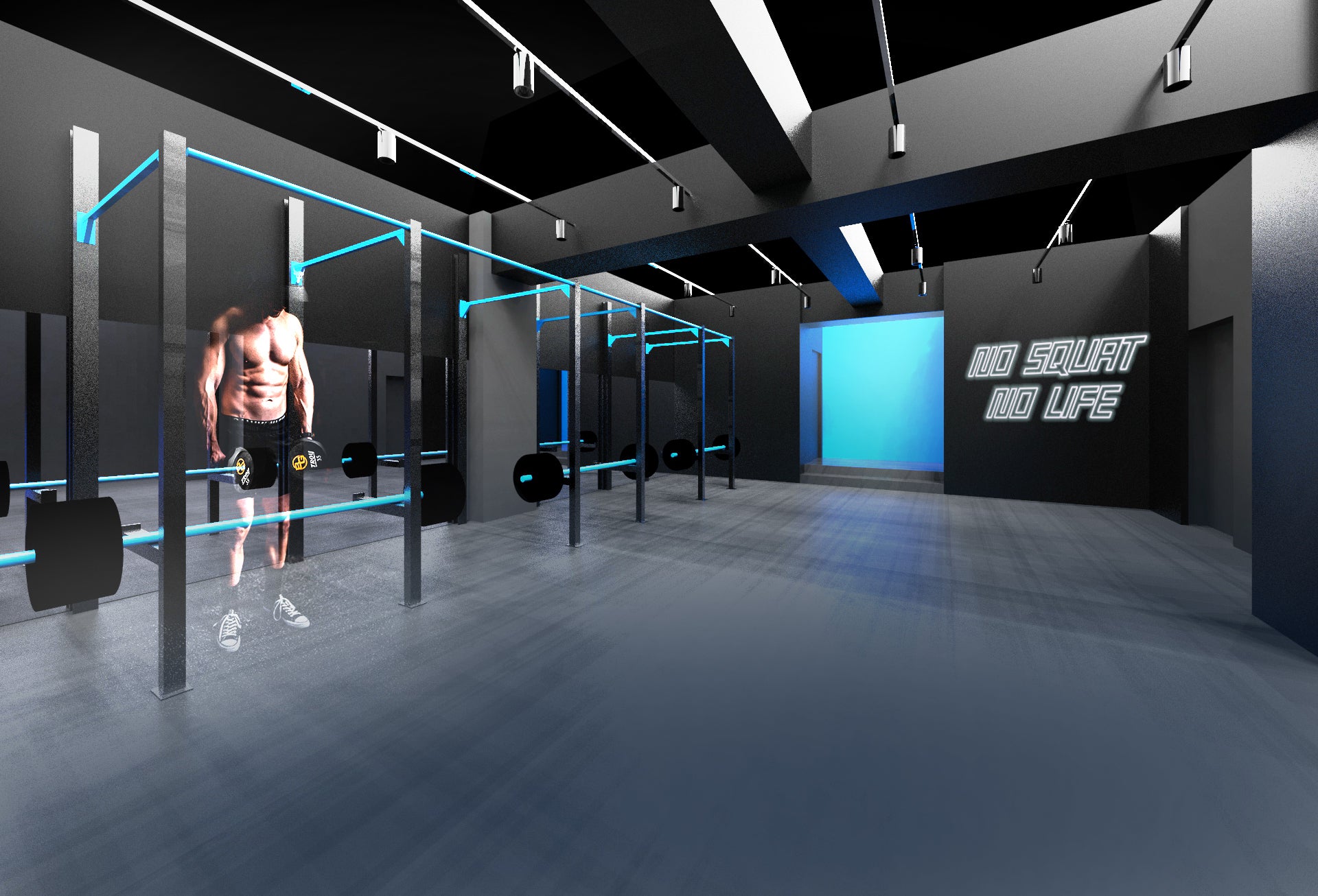 ジムのイメージ。トレーニング用のリグを設置。ブルーを基調とし、ライティングにもこだわったおしゃれな空間に。入会人数を制限する予定なので、スクワットラックが埋まっていることに悩まされることはありません。