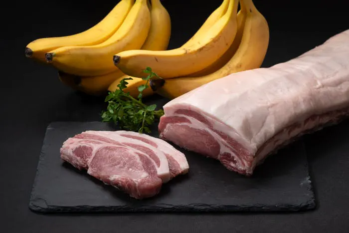 「えびすもち豚」は、兵庫県の株式会社マルヤスミートさんが飼育している淡路島産のブランド豚です。その特徴はバナナを飼料にした、いわば「バナナ豚」ということ。マルヤスミートの安次嶺社長がバナナチップに出会ったのは約10年前とのこと。傷物という理由で廃棄されるバナナを乾燥させてチップにし、飼料に配合して与えてみたところ、脂肪の質が変化し、甘味がぐんと増加。しかもその甘さがくどくなく、豚特有の匂いも抑えられることから、あっさりとした味わいでとにかく軽い!