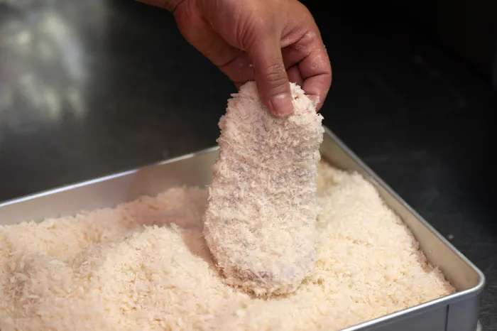 揚げ物の食感の肝になるのは「バッター液」と呼ばれる衣液、そして「パン粉」です。今回のとんかつには生卵を使わず、かつ冷凍対応の秘密のバッター液に衣がサクッとなる技が隠れています。またさまざまなパン粉のブレンドで試作し、最終的に程よい歯切れとおいしい音を奏でる国産の生パン粉の配合にたどりつきました。考えたのは、まず味、そして次にコンビニエンス性=いかにご家庭での手間を省けるか。