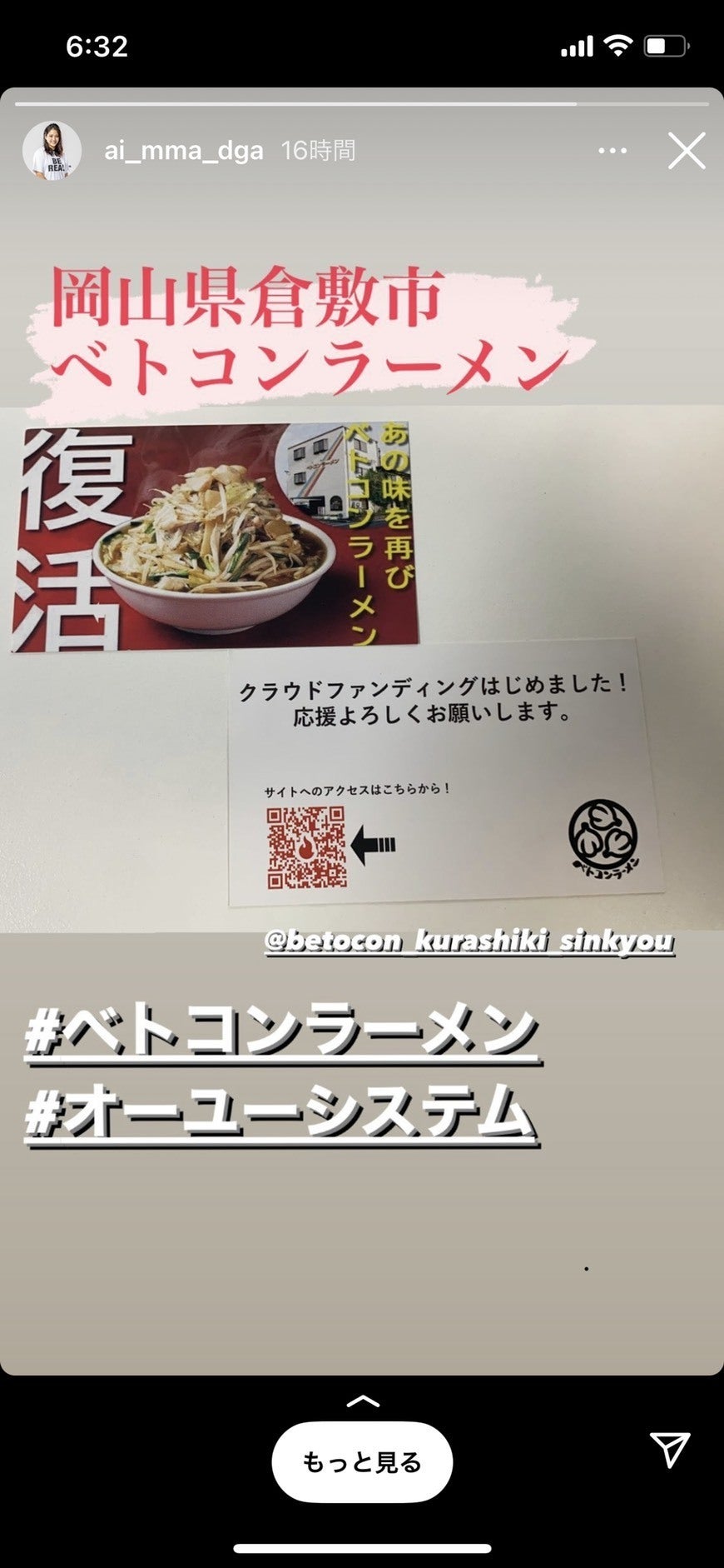 みなさんこんにちは!ベトコンラーメン倉敷新京です!少し前の話にはるのですが、、、格闘技のRIZINにも出場されている「あい選手」がご自身のInstagramのストーリーでベトコンラーメンのことを載せてくれました!なんだか不思議な感覚です。。。またご支援いただいた方の数が350人に到達いたしました。本当にありがとうございます!今後ともベトコンラーメン倉敷新京を何卒宜しくお願い致します。