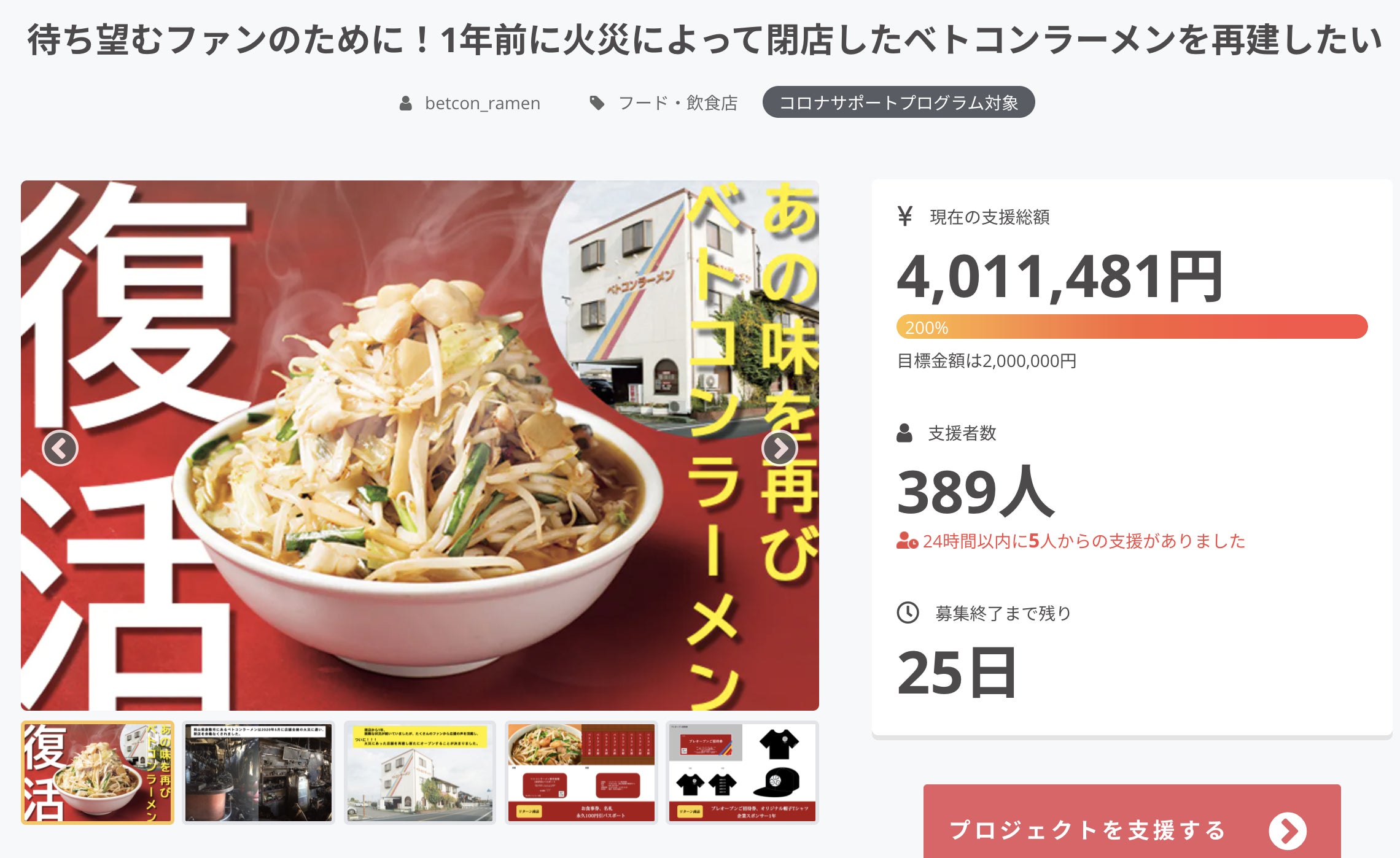 皆様おはようございます。7月30日に始まったクラウドファンディング、本日、8月21日を迎えて23日目になりました。これまでに皆様のお力添えのおかげで信じられないくらいのご支援を頂戴しています。8月21日 9:08時点総支援額:4,011,481円支援人数:389人達成率:200%支援人数400人まで、あと11人、、、本当にびっくりしています。スタート時にはこんなにもたくさんの方に、たくさんの支援を頂けるとは想像していませんでした。日々皆様のご支援、応援を頂戴し、ベトコンラーメンの復活を待ち望んでくれている方がたくさんいらっしゃることをものすごく強く感じ、再建を決めて良かったと心から感謝しております。幸い、募集期間はまだ25日残っています!最後までメッセージをお送りし続けますので、応援のほど何卒よろしくお願いいたします。
