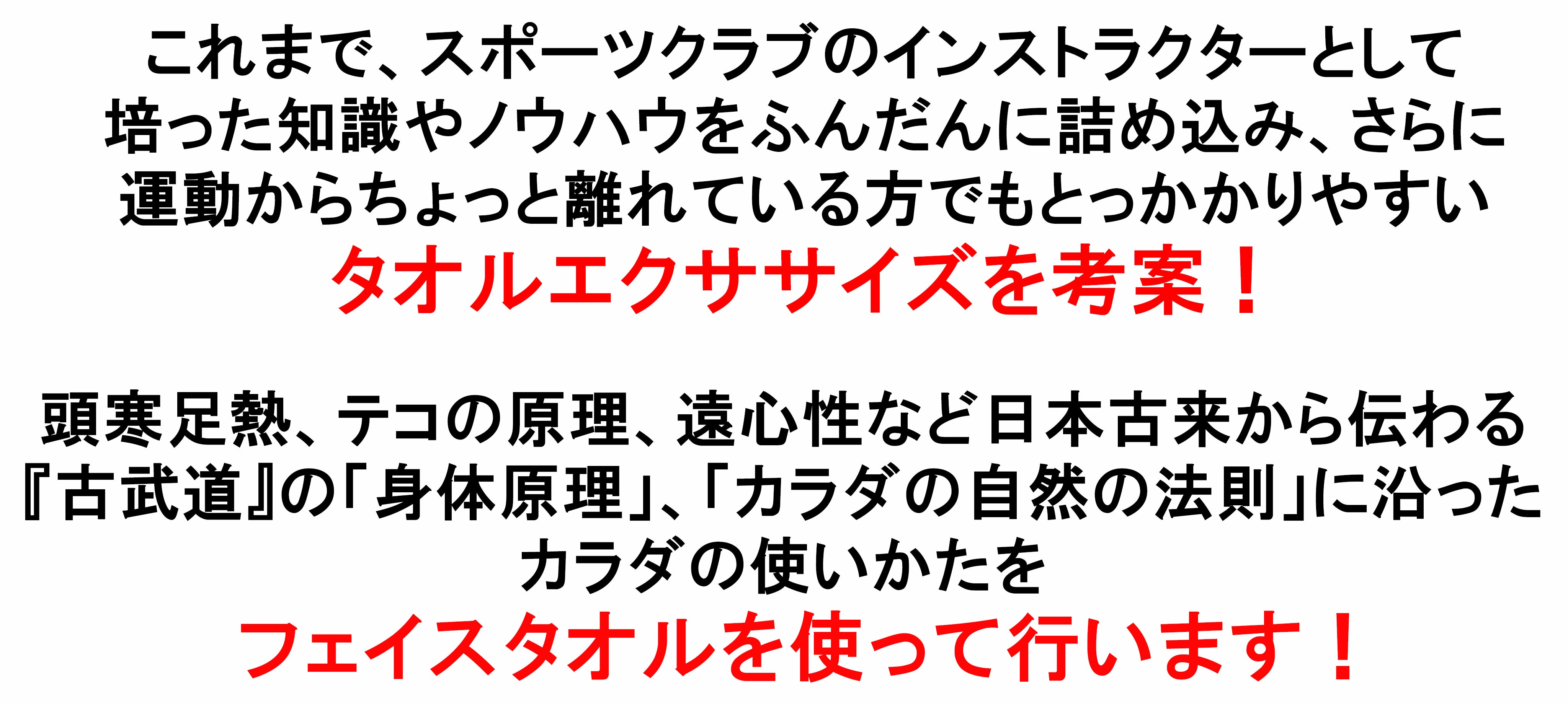頭寒足熱、テコの原理、遠心法など、日本古来から伝わる『古武道』の「身体原理」、「カラダの自然の法則」に沿ったカラダの使い方をお年寄りや初心者、アスリートまで幅広く使えるオリジナルエクササイズを考案しました。
