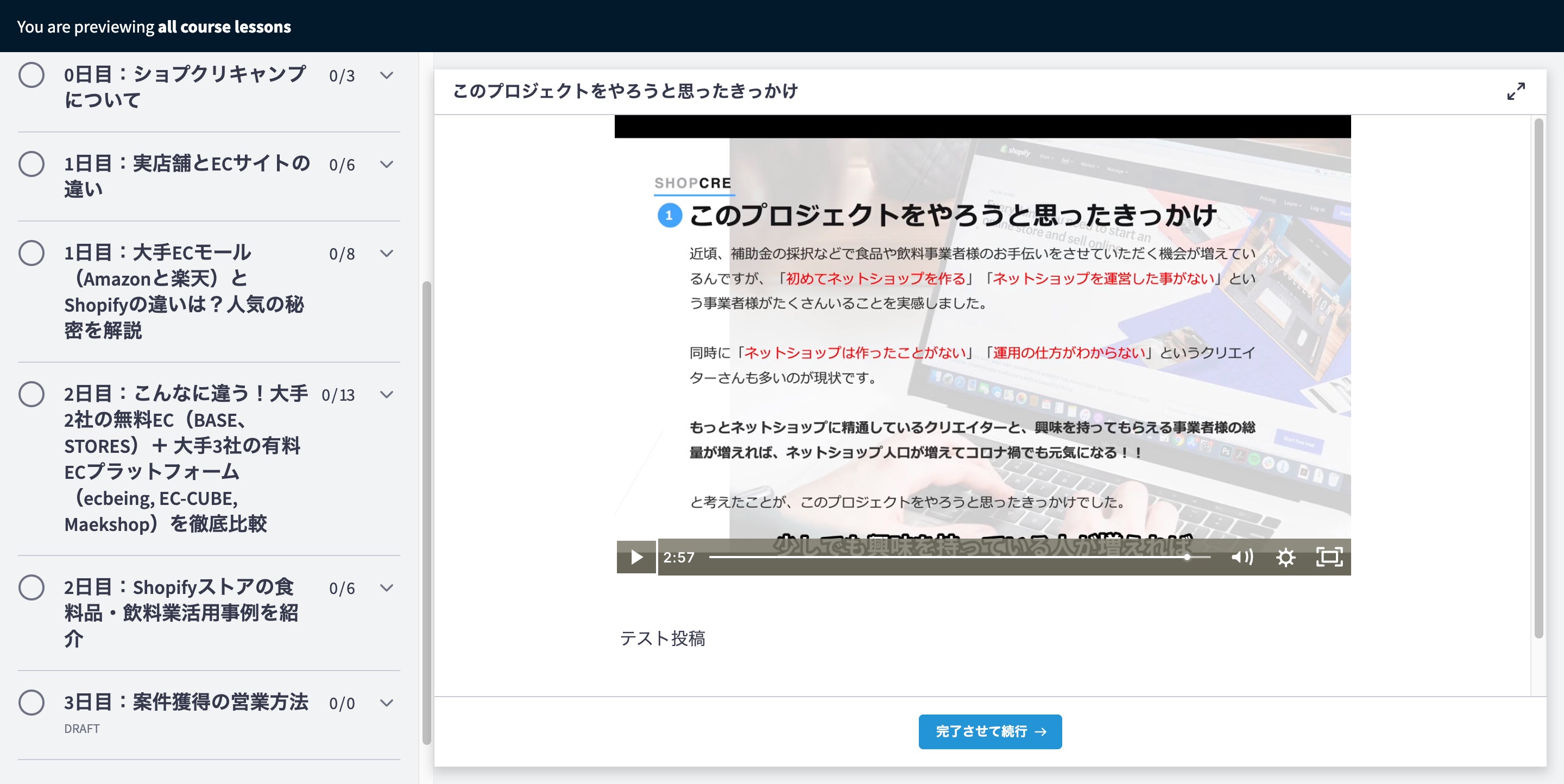 応援してくださってる方へご無沙汰しております!飲食業の応援×Shopify企画の発起人のスズコー、改めてコーです。最近日本本州でも冷え込んでますが、風邪などひいてませんか?遂に正式に発表します!ショプクリキャンプ公開が決まりました!ショプクリキャンプ公開が決まりました!ショプクリキャンプ公開が決まりました!(大事なことなんで3回言いました)というかむしろ。予定より遅れちゃってすみません。。。(ほんぎょうが(ry)本日は、「なにが他のスクールと違うの?」っていう所を簡単にご紹介できればと思います。❶飲食業特化→実際にサイトを作る&運営する対象の方は、架空の飲食店を経営されている方を想定した教材になってます。❷1コマ3分動画でわかりやすく解説→売れるサイトにするためのノウハウを「短い時間で、どこでも、いつでも」見れるようにショート動画で解説してます。短いので1分以内、長いので4分いかない尺の動画で解説。スマホでも閲覧できるので、移動中やお仕事の休憩中、隙間時間とかでも勉強しやすくなってます。❸0→1で案件獲得→周りの制作エンジニアやデザイナーを見渡すと、案件をどうやって取るのかわからない。困っているので知りたいっていう方が大勢いるのをみてきました。なので、結構営業に使えるための資料作りに時間をかけてます。たとえば、他のECモールの違いは?いろんなカートシステムとなにが違うの?事例も交えて解説しているレッスン日もあります。よろしければ、こちらの動画でも詳しく解説してますので、騙されたと思ってみていてくださいませ!https://youtu.be/vPrdEgGtfuQ*この動画のスポンサーになってくださった、スバキリ紹介様NoCodeCamp様よこさんゆうとさんこの場を借りて感謝申し上げます。一番最後の方、エンドロールに載せてますので^_^サービスLPでは、一部無料で公開しているレッスン動画も見ることもできますのでよろしければ!https://shopcrecamp.thinkific.com/本日は以上です。コー