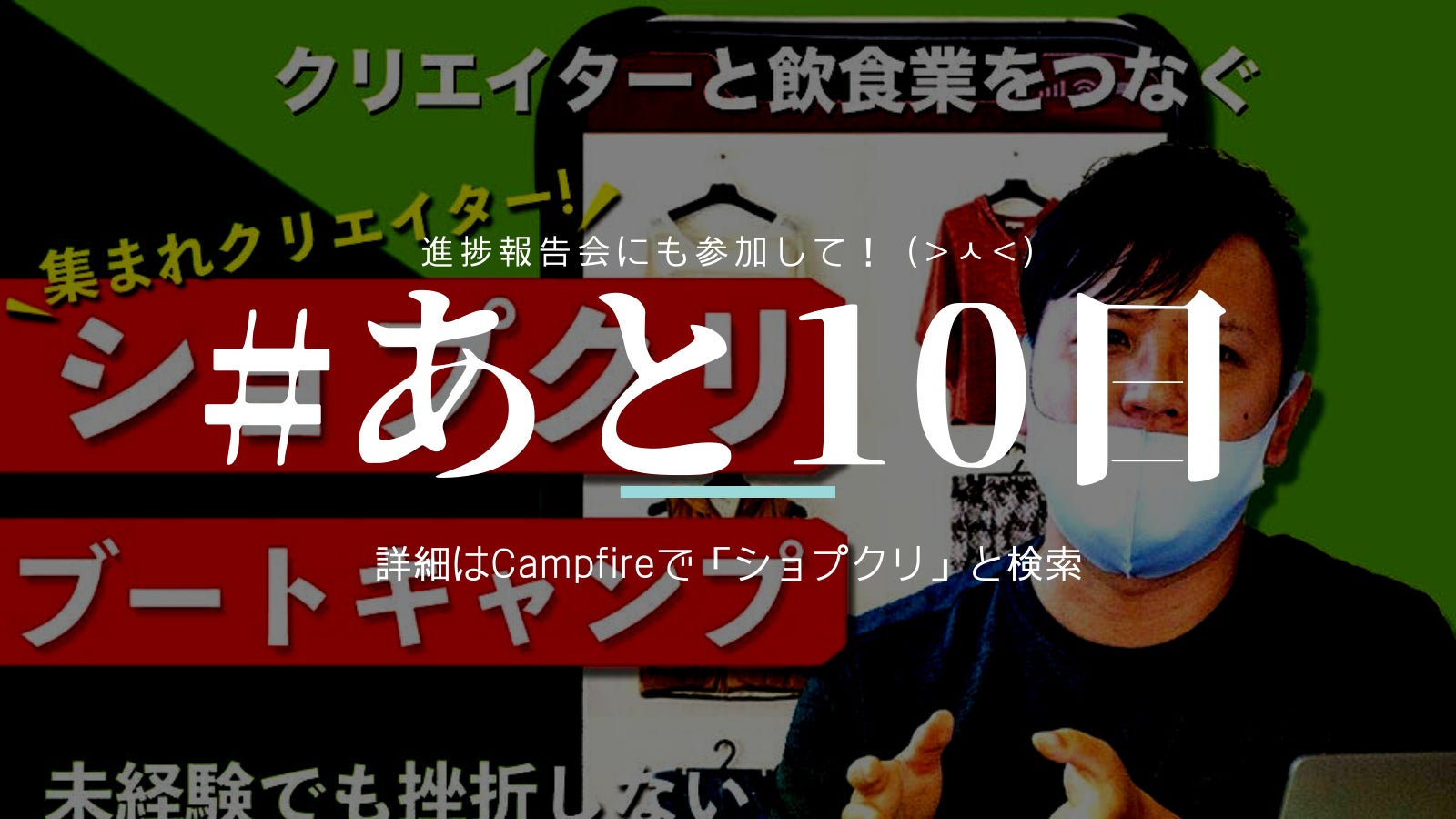 皆様、こんにちわ!このプロジェクトが終わるまで、残りあと「10日」となりました。皆様のご支援のおかげで、目標金額の48%までくることができました。本当にありがとうございます!!このプロジェクトが終了しても、ぜひこのプロジェクトのことを多くの方々(特に飲食業の方のECサイト支援にご興味あるWeb系エンジニア・デザイナー)に広めていただけましたら幸甚です。集まりました支援金に関しましては、ショプクリキャンプのさらなる教材開発(特に、サイト運用後のノウハウに関して)の費用に充てたいと存じます。また、お気に入り登録をしてくださった方に理解を深めるために、簡単な進捗報告会を来週火曜日に実施する予定です。今回のコンセプトや収録予定のカリキュラム、台本等々の資料・マインドマップを一部公開する予定です。早退・遅刻歓迎ですので、どうぞお気軽に寄っていただけると幸いです。題名:第1回ショプクリキャンプ(クラファン)進捗報告&交流会日時:8/24(火) 21:00 〜 22:00詳細:以下のイベントページhttps://shopify-meetup.connpass.com/event/222388/皆様、最後まで応援のほど、何卒よろしくお願い申し上げます。ーーーーーーーーーー現在も以下のリターンを募集しております。応援のほどよろしければ…!mm■3,000円ネットショップ構築セミナー(30分・9月予定/セミナー後懇親会)■7,000円オススメテーマ&アプリ資料プレゼント■10,000円ネットショップコンサル(60分・オンライン相談)■39,800円ショプクリブートキャンプ(動画教材・オンライン相談/実務経験者による質問サポートを1ヶ月間し放題)■400,000円ネットショップ構築ベーシックプラン《スポンサー・応援リターン》■1,000円お礼のメール■4,000円Youtube個人スポンサー(YouTubeにお名前掲載)■30,000円Youtube企業スポンサー(YouTubeに企業名掲載)■100,000円シャツスポンサー(胸に企業名掲載)https://camp-fire.jp/projects/view/4469592021年8月21日スズコー