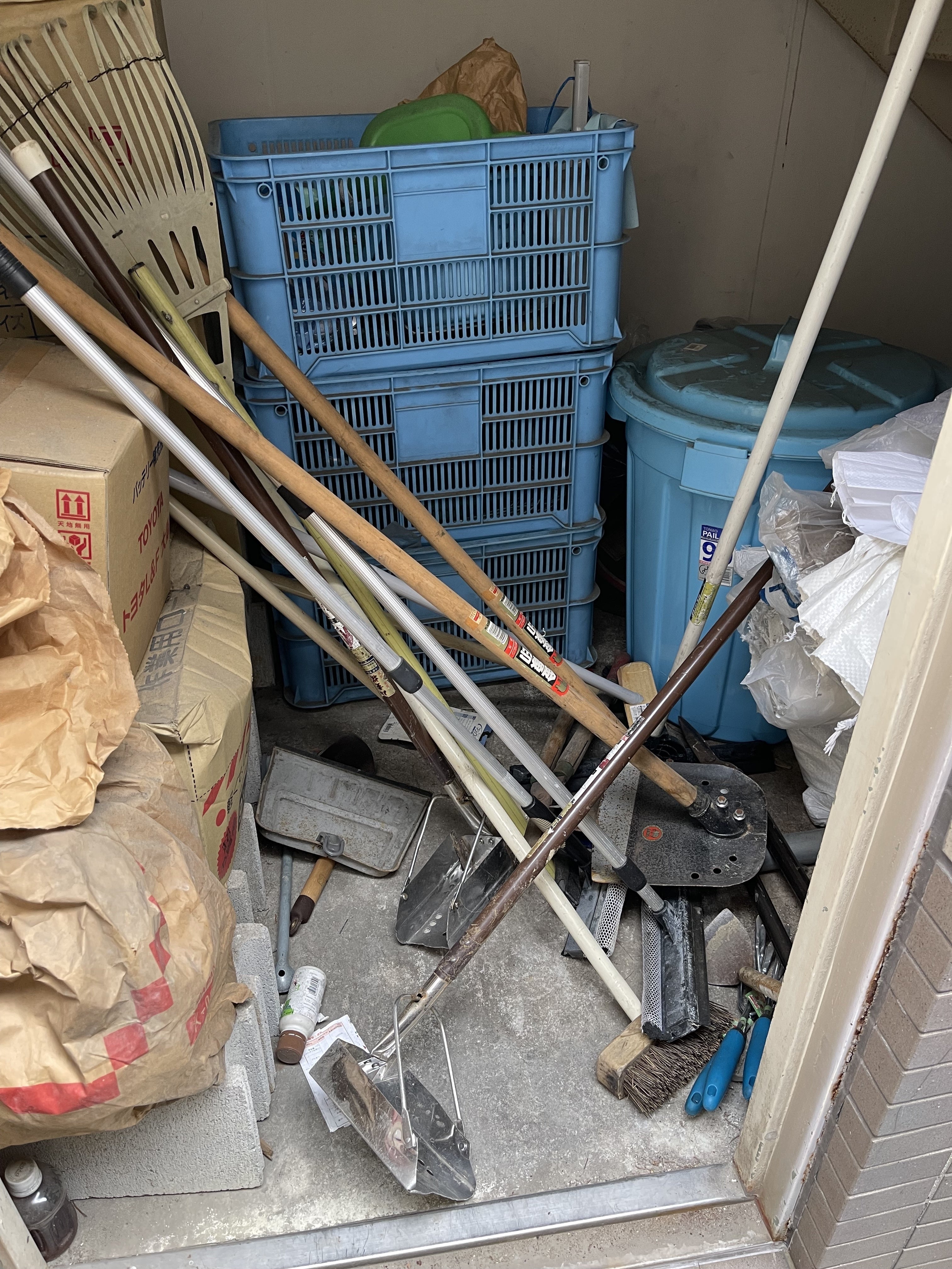 乱雑に置かれている、清掃用具、農機具、工具類などを