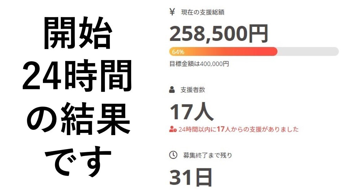 17人、総額258,500円のご支援をいただきました!(達成率64%)