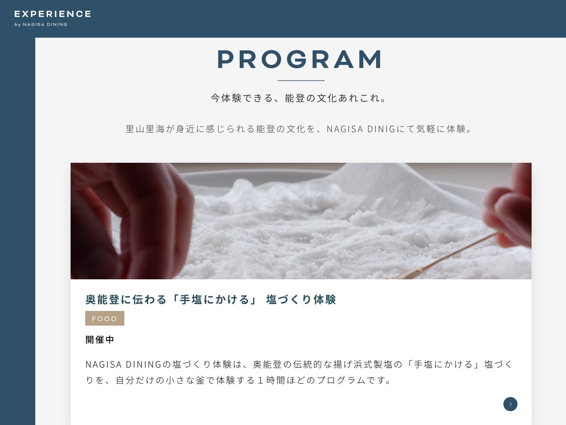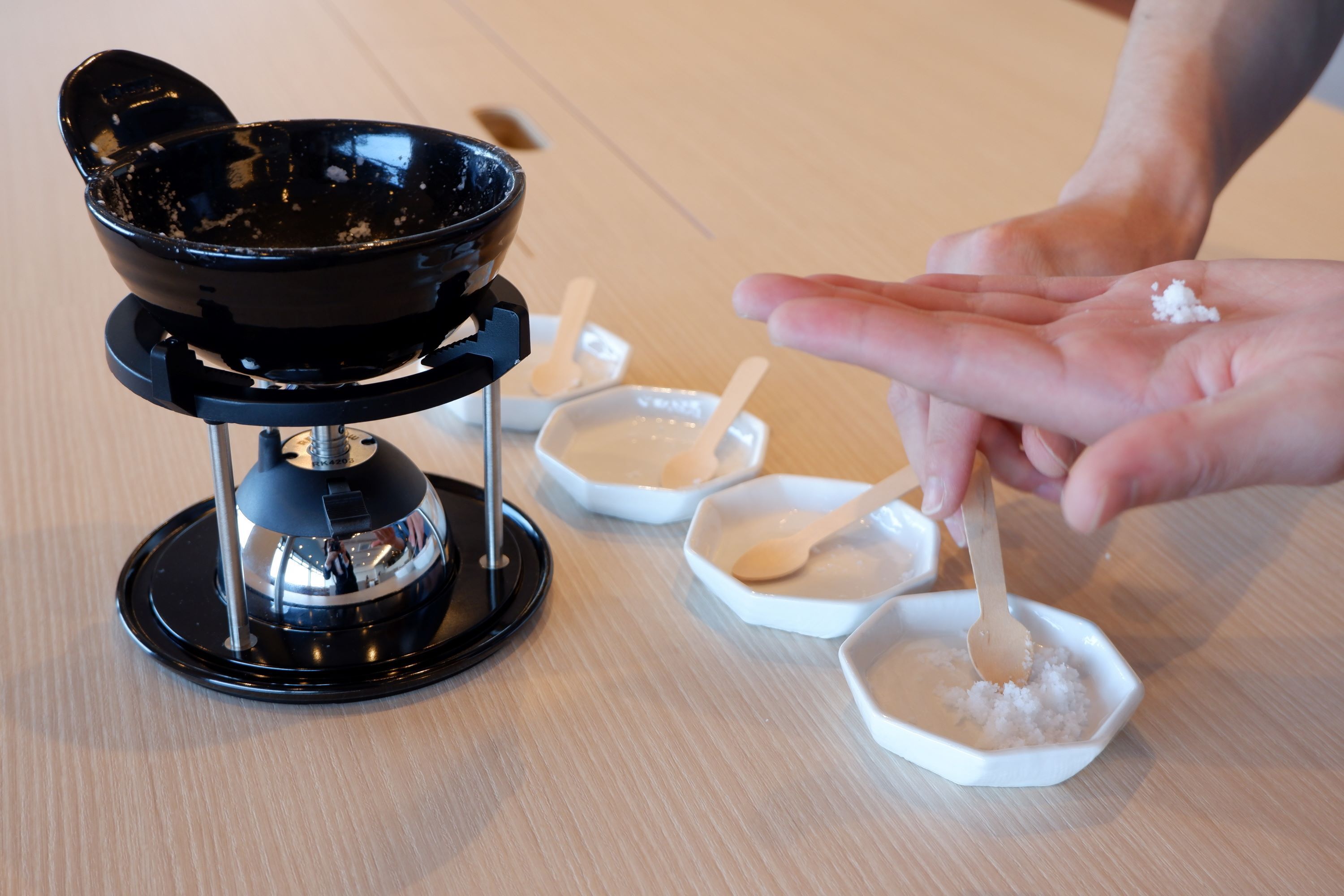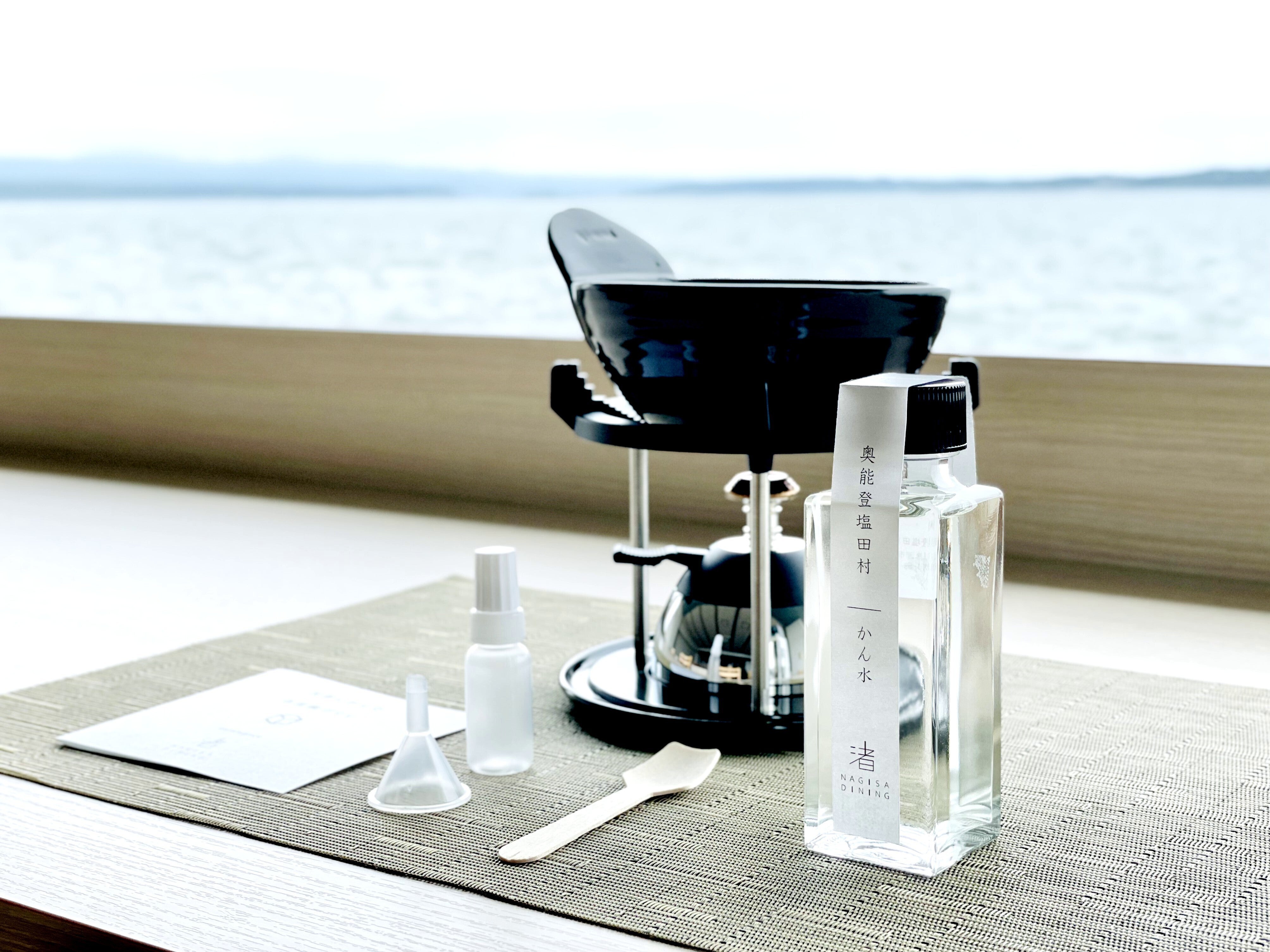 2021年3月~体験コンテンツとして販売をしているNAGISA DININGの塩づくり体験プログラムは、石川県珠洲市で伝統的な塩づくりを行う奥能登塩田村から譲っていただいた貴重な「かん水」(塩分濃度の高い海水)を、自分だけの小さな釜で煮詰め、お塩の味を決める焚き上げ工程を体験するものです。