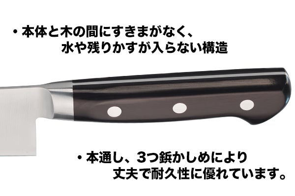また、プロの料理人が使用する「口金付き、本通し、3つ鋲かしめ」になっています。