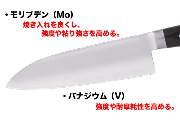 ブレードには、医療用メスなどと同じモリブデンバナジウム鋼を使用しています。モリブデンバナジウム鋼は、「モリブデン(Mo)」と「バナジウム(V)」によって構成された鋼です。