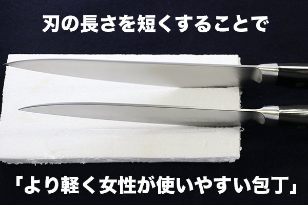 今回、かっちゃんさんと何度も試作を繰り返し、三徳包丁は165mm・牛刀は180mmという、「より軽く女性が使いやすい包丁」を開発することに成功しました。