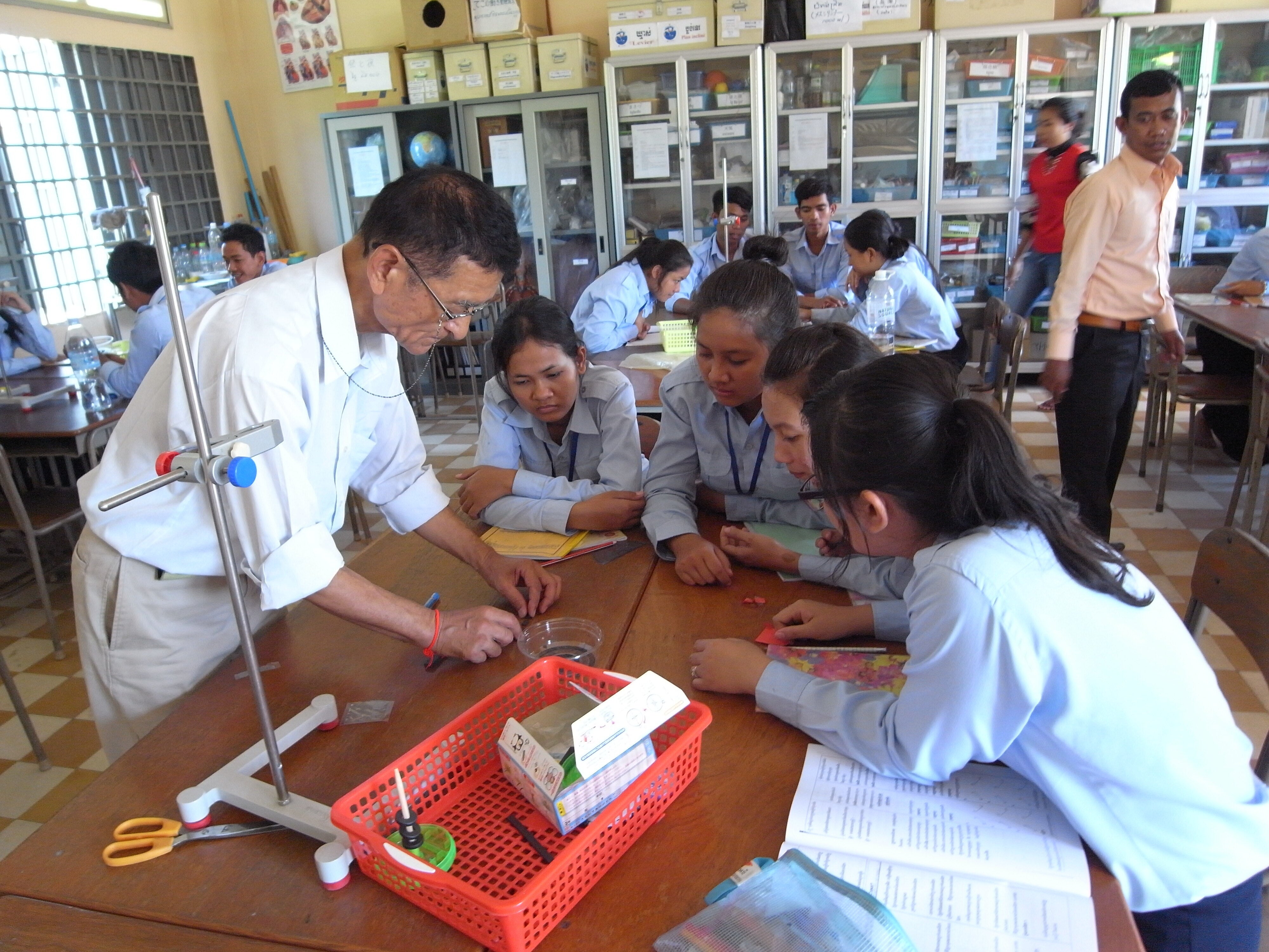 写真:教員養成校で実験器具を使い、指導するアドバイザー