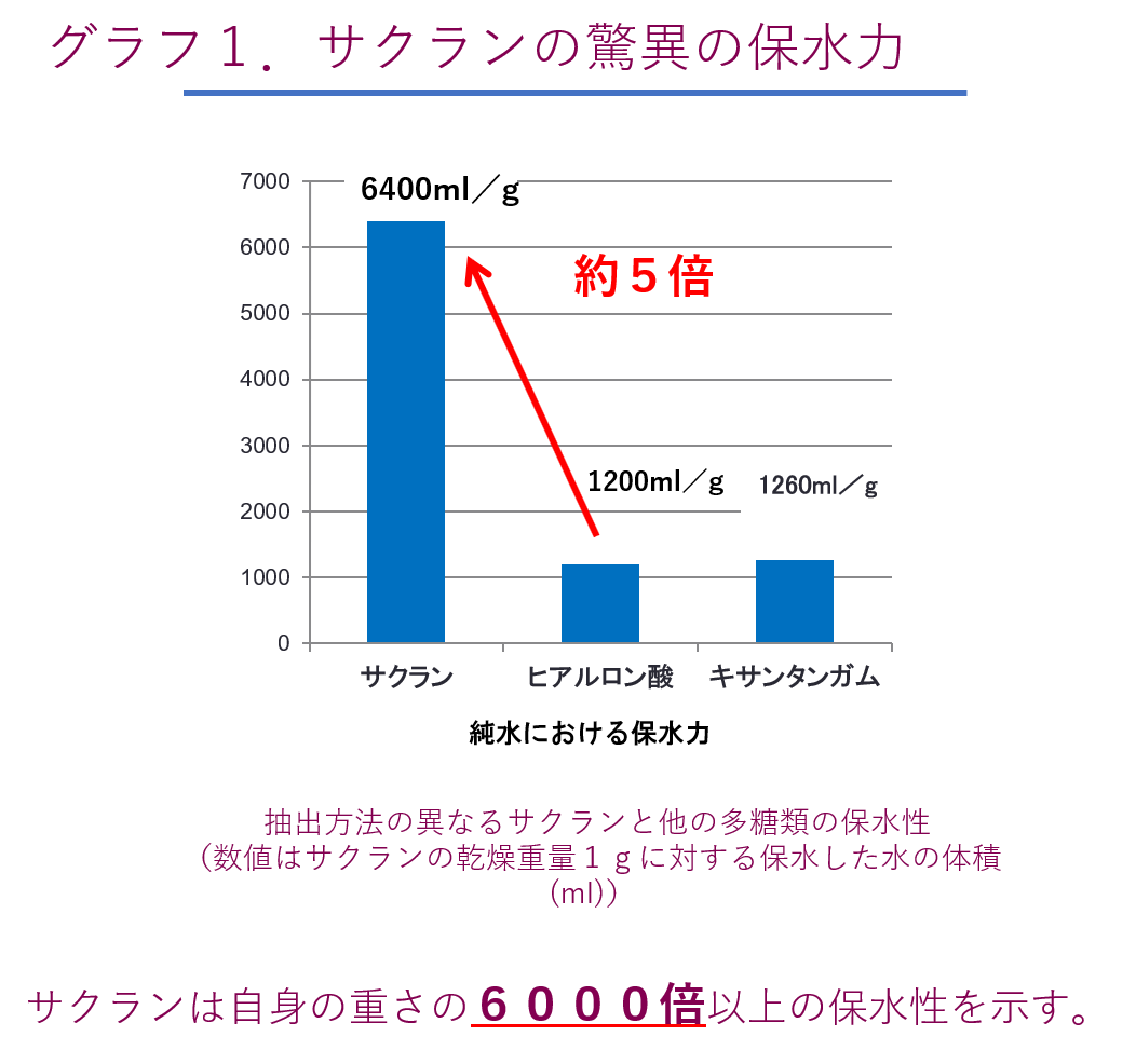 サクランの最大の特徴は脅威の保水力にあります。高保水成分として名高いヒアルロン酸との比較実験では、約5倍の保水力があり、かつ蓄えた水分をヒアルロン酸の3倍以上長く保持することが分かっています。