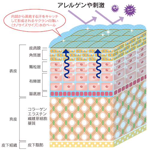 皮膚に幕を張ることによって、中からの水分の蒸発を防ぎ、また外からの刺激からも守ってくれます。ほかの保湿成分だと皮膚に浸透してしまい、表面にとどまる時間が短いので、頻繁に塗らないと効果が得られないのですが、サクランは皮膚表面を覆ってしまうので、それが長時間持続させることができます。