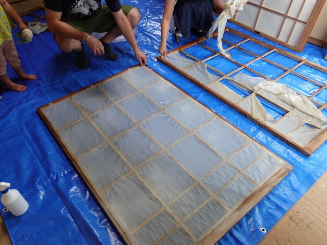 障子全面に霧吹きで水を吹きかけて浸します。