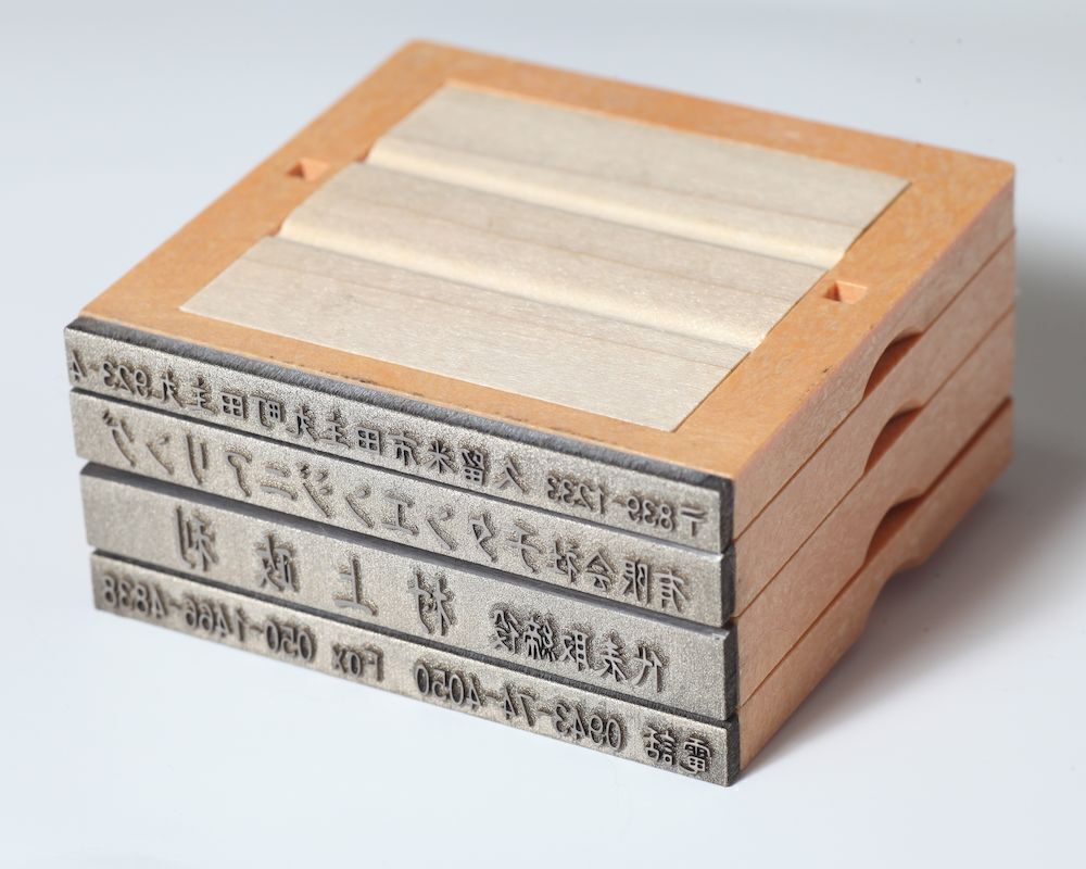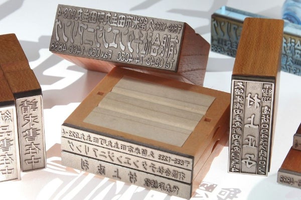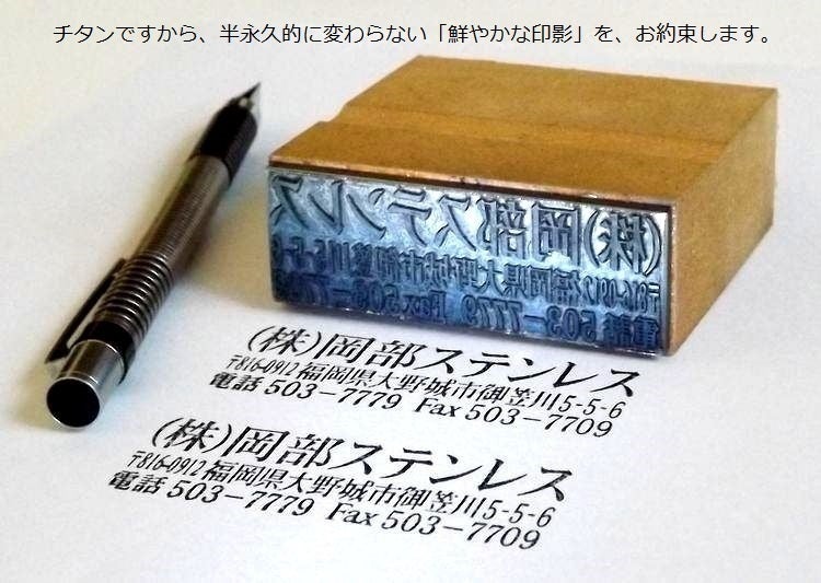 「チタン製アドレス印判」は、世界初の「試み」なのです。100%消耗品でかつ安価なゴム製の印判に換わる画期的な商品をお届けできます。文字だけでなく、「絵柄」も金型なしで、「絵柄模様入り」の「オリジナル・アドレス印判」を簡単に製作できるのが、最大の「特徴」です。
