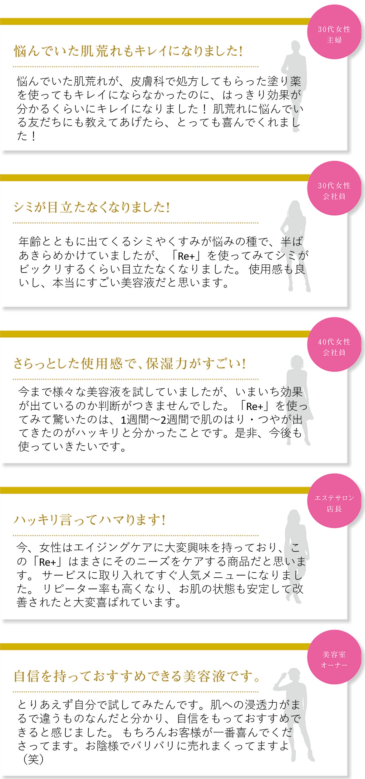 私たちが自信を持ってお届けする”新世代の美容液”【Re+ serum】をぜひお試しいただき、効果を実感してください!私たちの思いに賛同していただき、一人でも多くの方に【Re+ serum】を手に取っていただけますよう、どうぞよろしくお願いします。