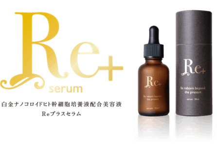 美容液【Re+ serum】 は、その最先端の技術であるヒト幹細胞培養液に白金ナノコロイドを加えて浸透力をアップ!あなたが美しく年齢を重ねるために欠かせない、〝新世代の美容液〟です。