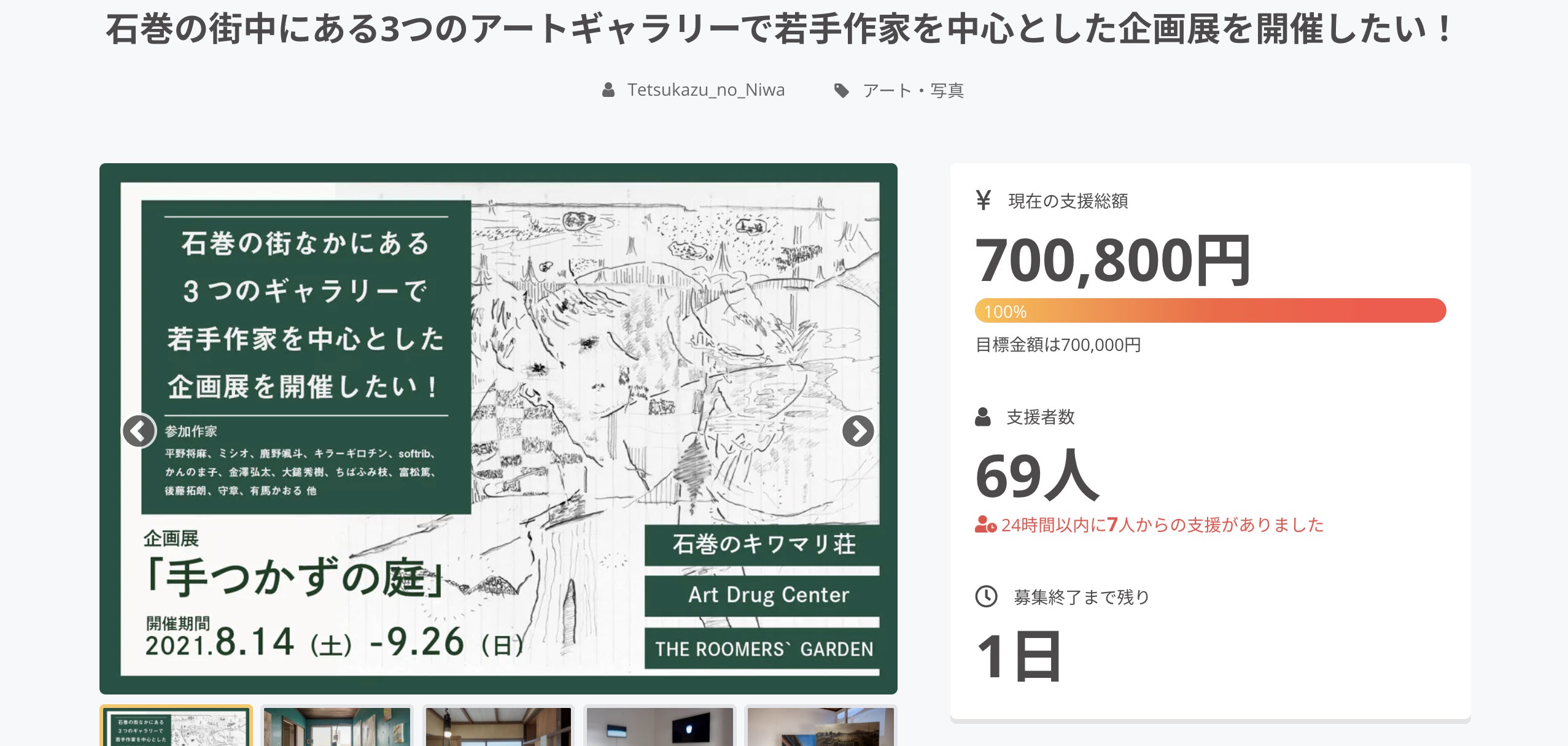 こんにちは。企画展代表の鹿野です。皆様のあたたかく、力強いご支援・ご協力により、本日(8/11) 10時2分にプロジェクト目標を達成することができました!!ご支援・ご協力いただいた皆様、本当にありがとうございます。今年の春に、この企画展をやることが本格的に決定し、どのような企画展にすれば個々人の制作活動を続けていけるような企画展ができるか考えていました。クラウドファンディングに着手するにあたって「本当に達成できるのか」「自分たちに嘘をつかずに活動を発信することができるのか」と、不安なところもありましたが、結果として自分たちも納得できる発信方法で、目標に到達することができたかと思います。運営に関しては、正直まだまだ足りていないところがありますが、この企画展を一度だけのお祭りにはせず、継続して様々な企画展や活動を石巻で行っていきたいと思います。目標を達成するにあたって、TwitterやFacebookなどで投稿をシェアしたり、熱いメッセージを寄せて応援してくださった皆様、本当にありがとうございました。目標に到達することができたのも皆様のおかげです。終了まであと1日。ぜひ、このプロジェクトが終了する最後までご支援・ご協力を頂ければと思います。そして、あと3日でスタートする企画展「手つかずの庭」をどうぞよろしくお願いいたします。鹿野