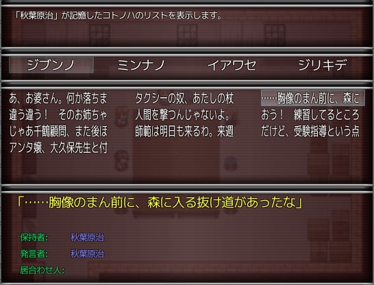 操作しているキャラクターが過去に聞いたセリフを思い出す機能です。これによりキャラの次の行動を促したり、推理を進展させたりします。