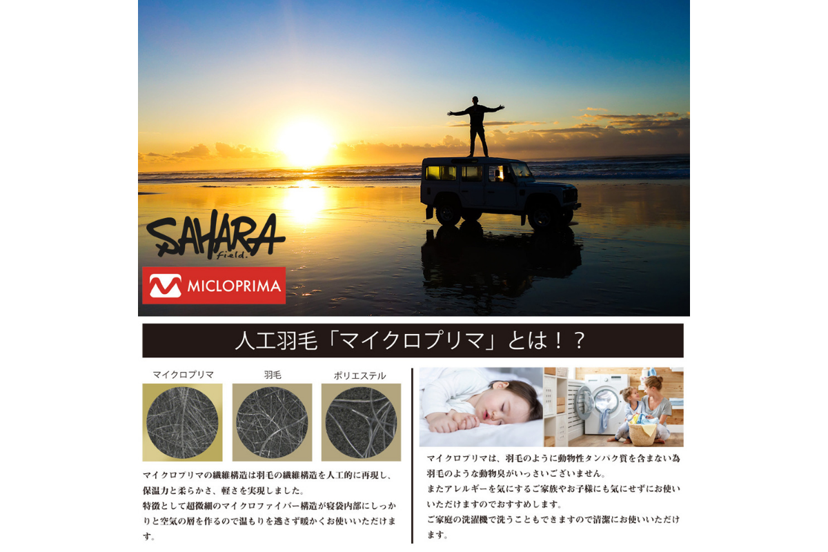 人工ダウン(マイクロプリマ)の繊維構造は羽毛の繊維構造を人工的に再現し、保湿力柔らかさ、軽さを実現します。現在、台風や地震など災害に対して必需品となるのが寝袋です。ですが、普通の寝袋は、持ち運びが大変です。この人工ダウンは、コンパクト使用になってまして、かつ非常に暖かさもあるので、オールシーズン使用することができるので、災害時にとても役立ちます。さらにアレルギーを気にされるご家族にたいしても、安心してご使用することできます。