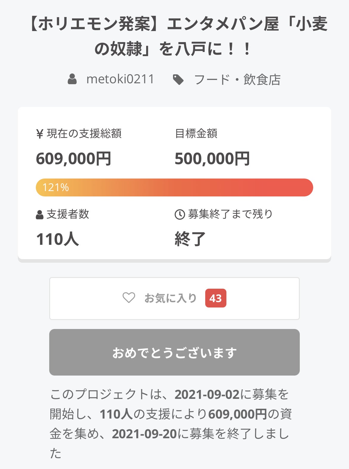2021/09/21 09:54目標金額を大きく越え達成することができました!!皆様本当にありがとうございます!!クラウドファンディングをスタートする前不安や葛藤がありましたが、自分としても新たな挑戦ができて本当に良かったなと感じています!人との繋がりの大切さを改めて感じることができました。ご期待に応えられるようしっかりと準備・研修を行っております!SNSの更新がままならず仕事が回っていないのが悔しい!!(笑)これからも応援宜しくお願いします! もっと見る