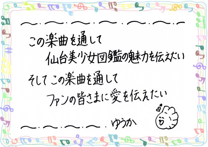 仙台美少女図鑑には様々な「夢」を描いている個性豊かなメンバーがいます。それぞれがクリエーターであり、エンターテイナーであるメンバーが自己表現する場を創造したい!そのためには「もっと個性的なアイテムが必要」と考えていました。その答えが「オリジナル楽曲」です。日々応援してくださるファンの方々や、まだ仙台美少女図鑑を知らない方へ、この「歌」へ私たちの想いを込めて届けていきたい。そして仙台美少女図鑑メンバーがそれぞれの個性を活かした「歌」「演技」「映像」など様々なステージを創造したいと考えております。