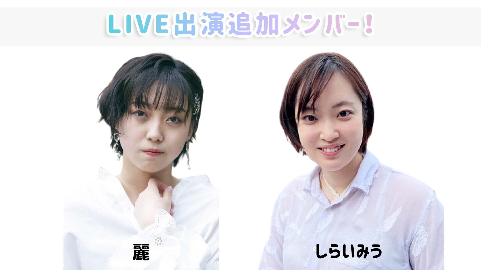 2021/09/30 19:0811月3日のライブへの出演する追加メンバーが決まりました!「麗(うらら)」と「しらいみう」の2名です!両名とも歌が大好きなメンバーですので、ご声援をよろしくお願いいたします!*楽曲制作も順調に進行中です!楽しみにお待ちください。 もっと見る残り1日。応援をよろしくお願いいたします!