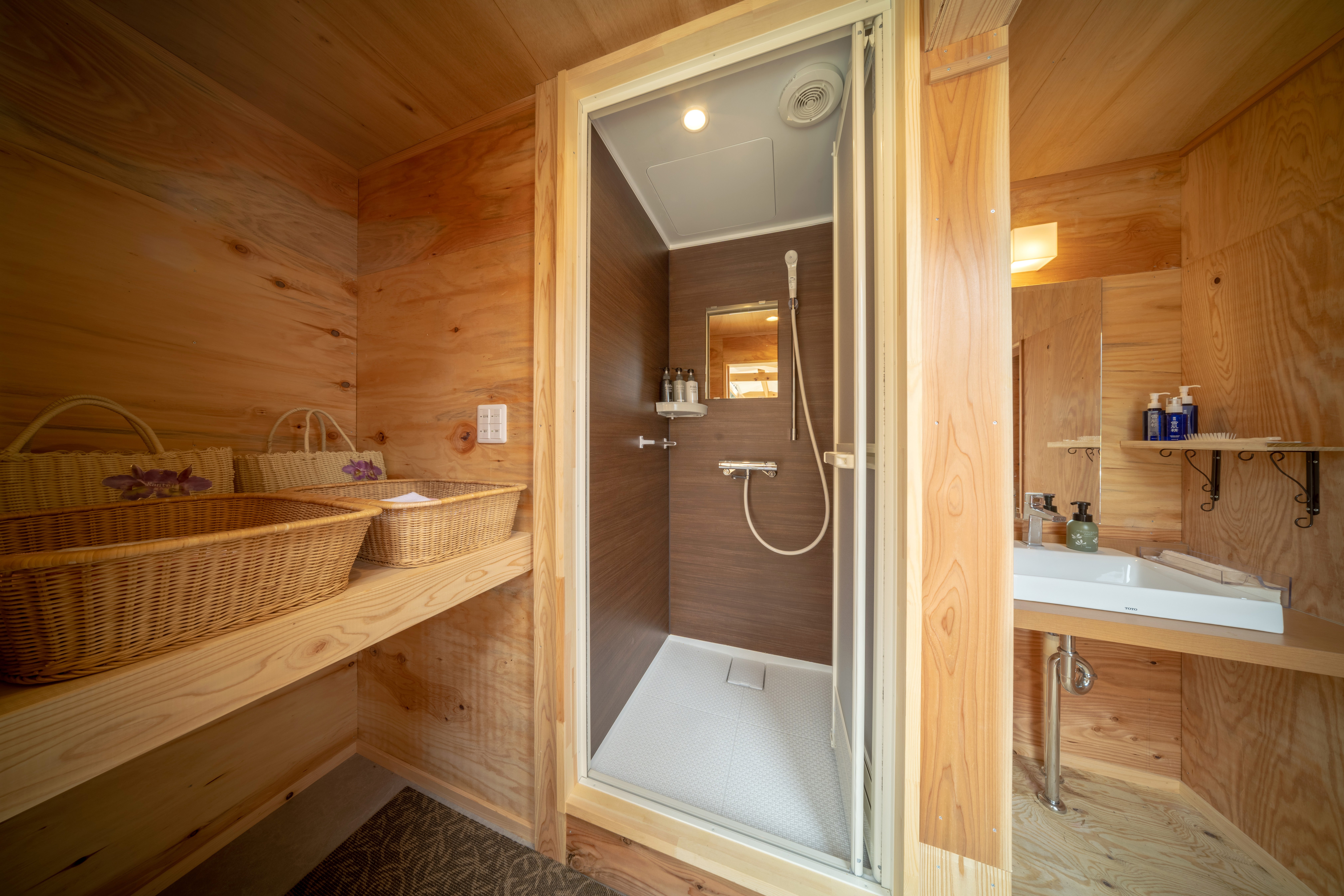 一棟貸切のため、他のお客様と接触する心配はございません。ヒノキの露天風呂やお手洗い、洗面台、食事場所、ワンちゃんと泊まれる棟にはプライベートドックランとお客様のプライベート空間をご提供させて頂きます。