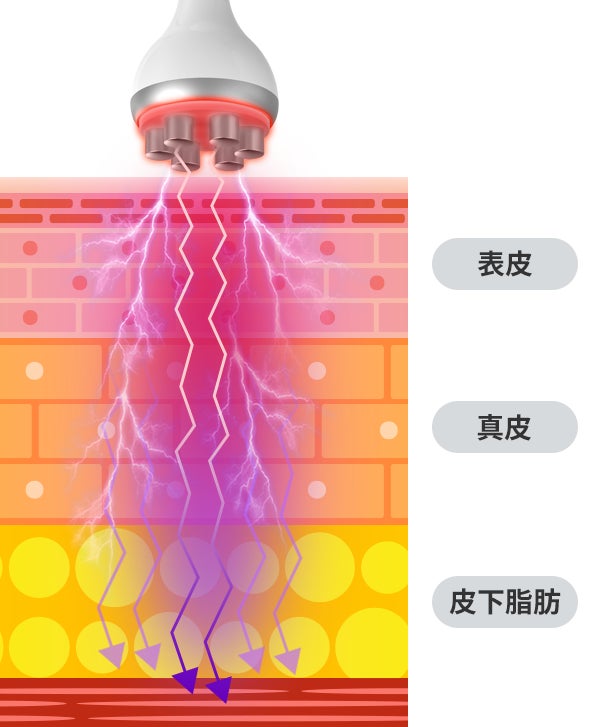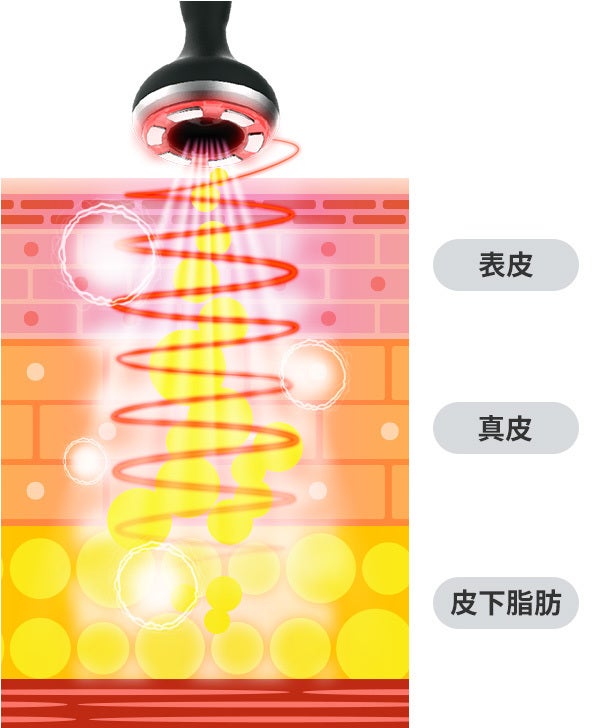 ラジオ波は深部まで温熱効果をもたらし血行促進し、体の深層体温を上げることでその後の施術の効果を高めます。さらに柔らかくなったセルライトを流しやすくし排出を促します。レッド LED の光で肌に潤いと弾力を与えながら、基礎代謝を高め、お肌のハリも UPできます。
