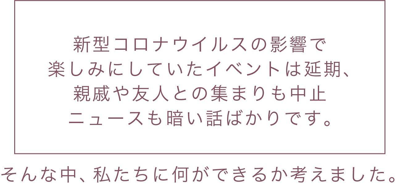 新型コロナウイルスの影響で、楽しみにしていたイベントは延期、親戚や友人との集まりも中止、ニュースも暗い話ばかりです。そんな中、私たちに何ができるか考えました。