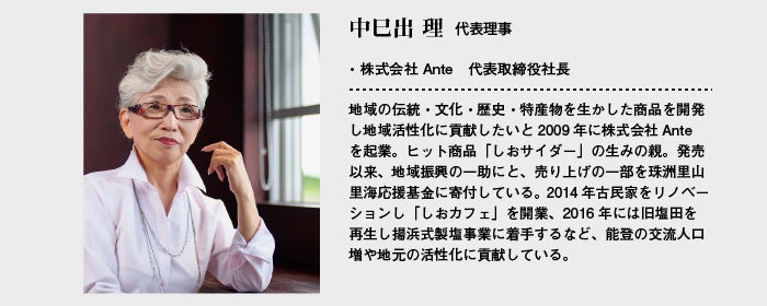 石川県珠洲市で小さなお弁当屋さんを営んでいる岩坂敦子と揚げ浜の塩を作りながら「しおカフェ」を開いている中巳出理(Ante代表)と石川の地元で地域創生のお手伝いをしている稲垣渉(金沢工大教授)と申します。