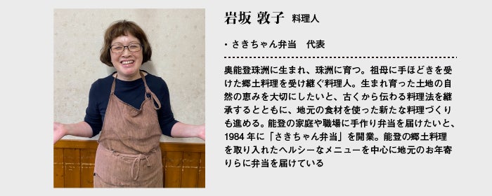 私は、能登半島の突端・珠洲で約30年間「さきちゃん弁当」を営んできました。そんなことから地元では、みんなから通称“さきちゃん“と呼ばれています。祖母から母へ、母から私へと代々受け継がれてきた郷土の味を大切にお弁当を届けてきました。