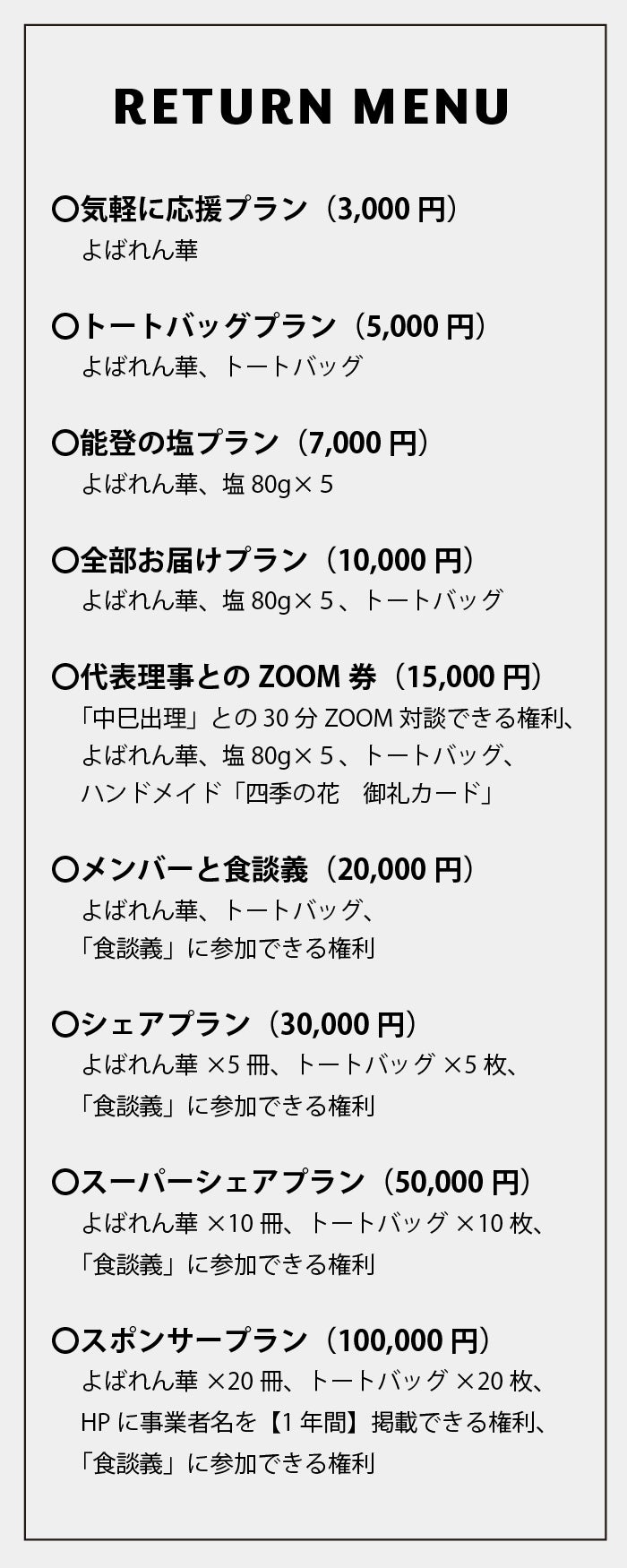 「よばれん華」の冊子以外にも、のとFood Studiesロゴが入った「トートバッグ」、奥能登珠洲で伝統技法によって作られる希少な「塩」、代表理事との「ZOOM対談」の権利、「メンバーと食談義」の権利といったさまざまなリターンが盛り沢山です。