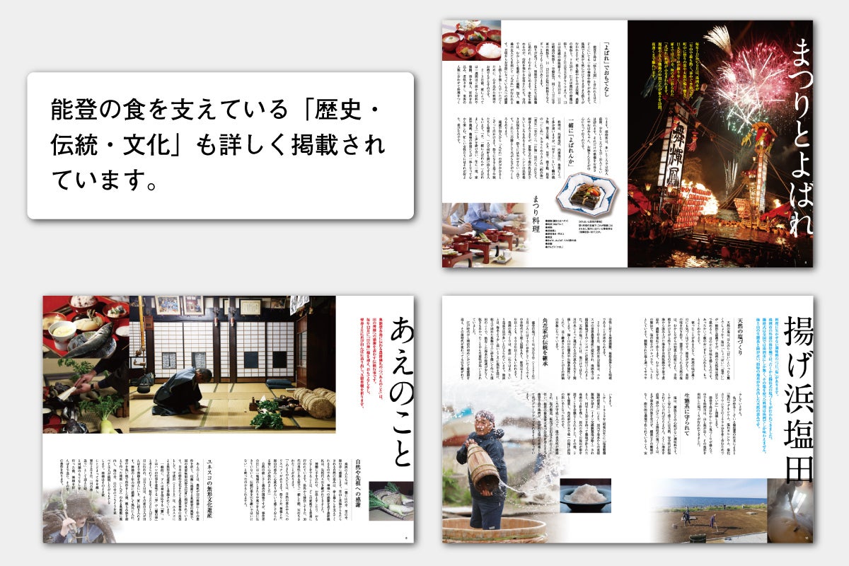 私たちが伝えたいことはこの一冊に網羅されています。奥能登の豊かな自然と風土、伝統文化の存在から説き起こし、恵まれた海・山・里の地元の食材の数々、連綿と受け継がれてきた故郷の味が集められ、それらを美しい写真と料理レシピで綴っています。