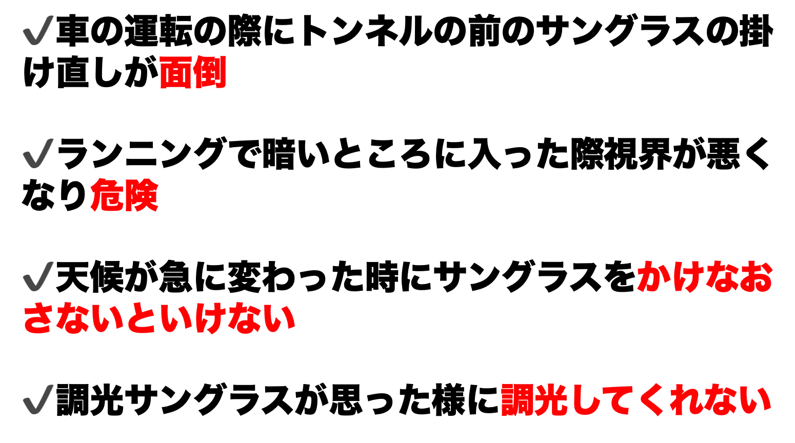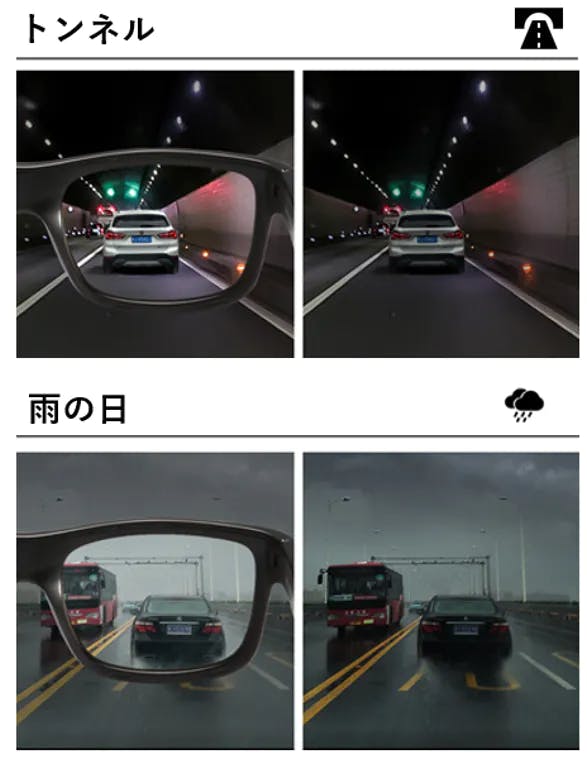 トンネルの出入りの際の面倒な掛け替えが不要、スイッチによる操作が不要、偏光機能によりトンネル内の眩い光をカット&しっかりと見やすさを確保、視界がはっきり見える事で道中に小さな障害物があっても視認し回避