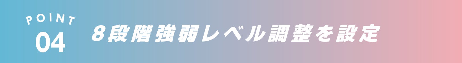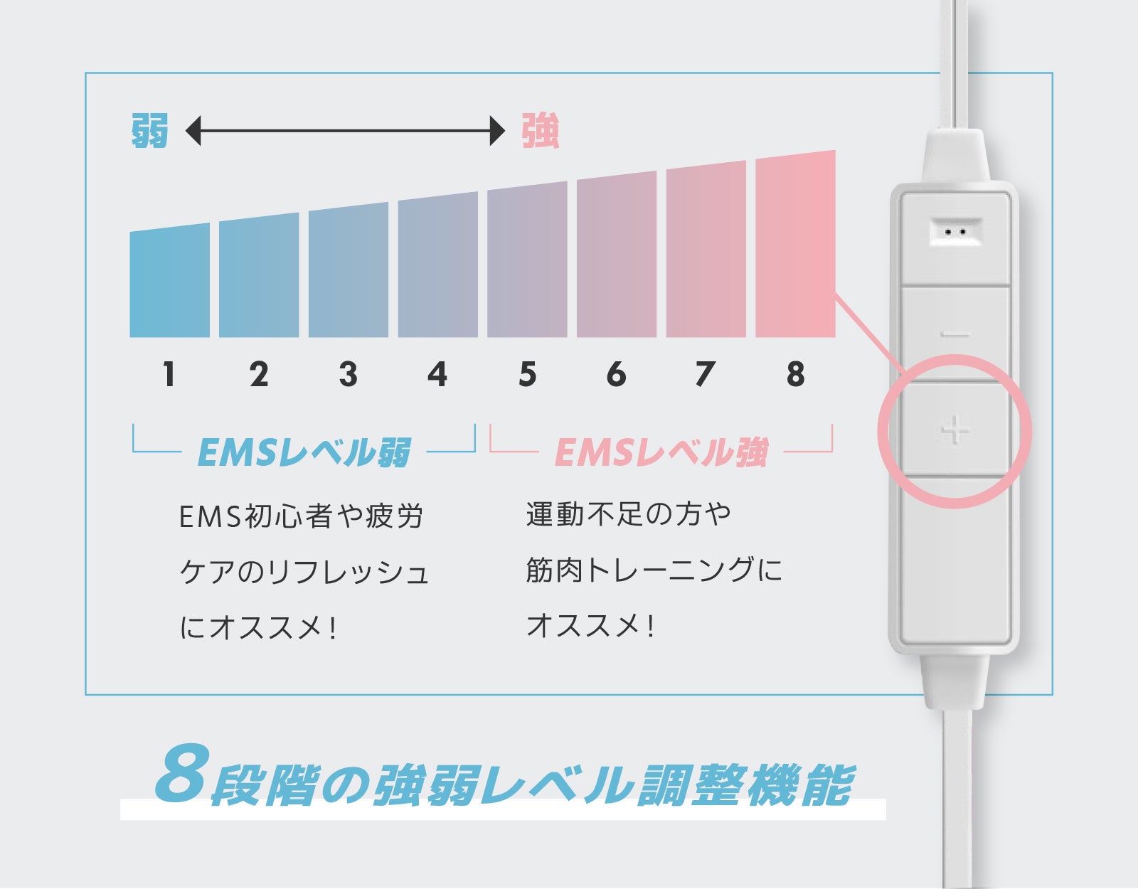 レベル1から始めていただき、慣れてきたら最大8段階までEMSの強弱レベルを調整いただけます。