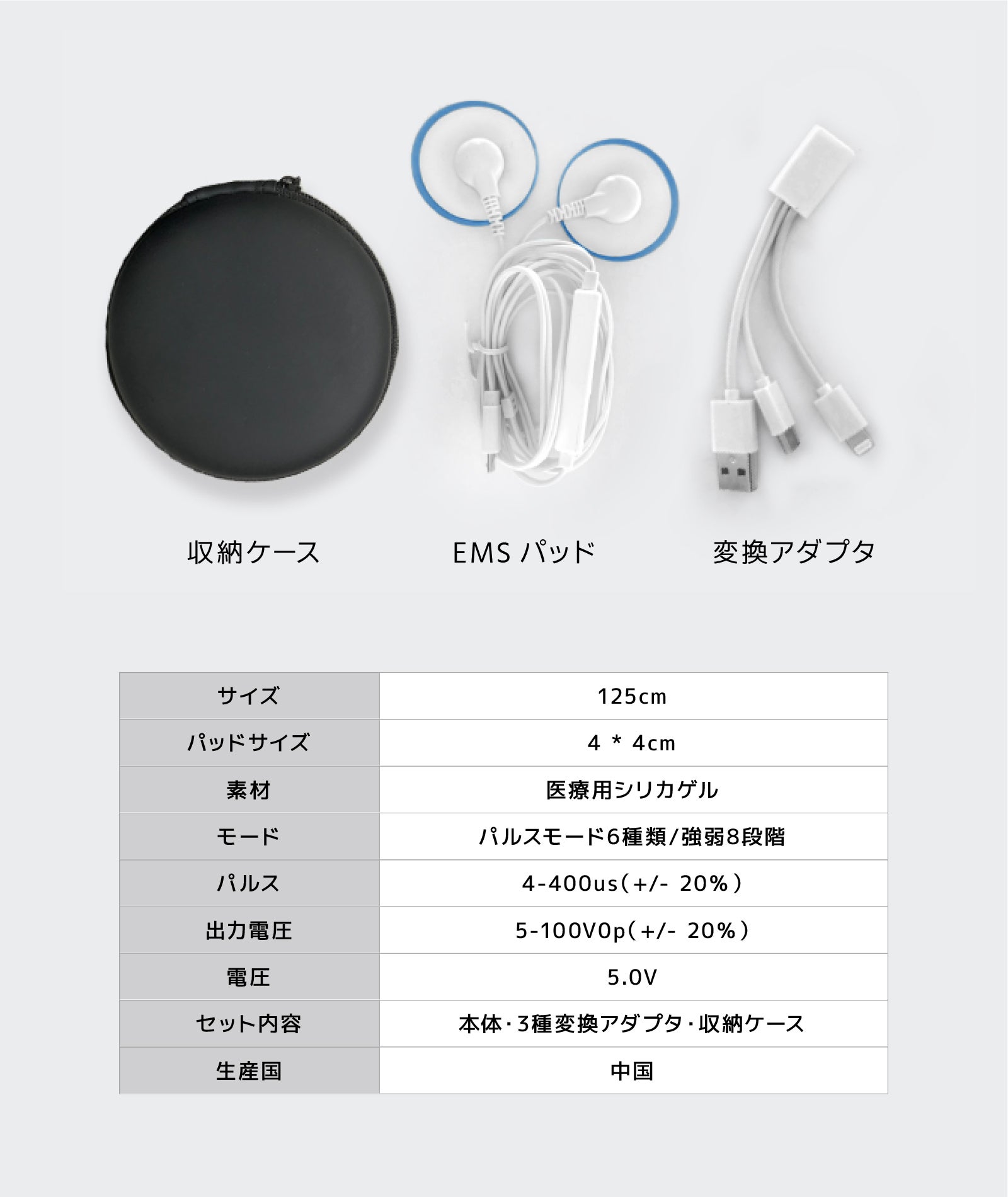 スマホにつなぐだけ!簡単操作でいつでもどこでも「エクササイズ」&「リフレッシュ 」ができる超小型マルチ電源EMSマシン。音楽を聴いたり、動画を見ながらの「ながらトレーニング」。持ち運びしやすい携帯用の専用ポーチ付!