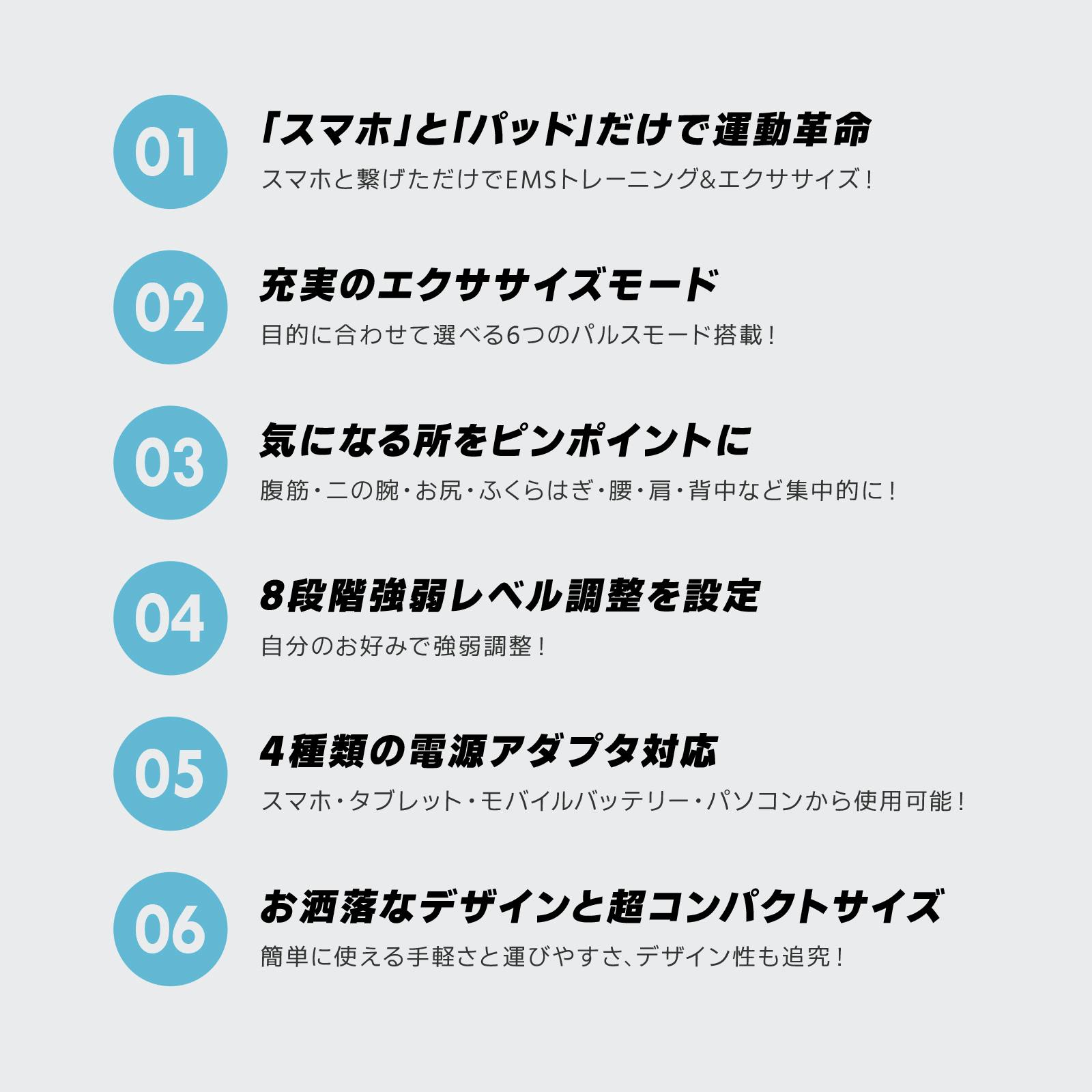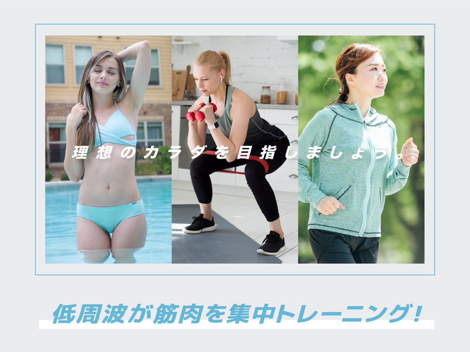 お手持ちのスマホに繋げるだけで、低周波による筋肉へのアプローチと理想的なボディを目指すためのEMSトレーニングができる画期的な低周波機器です。