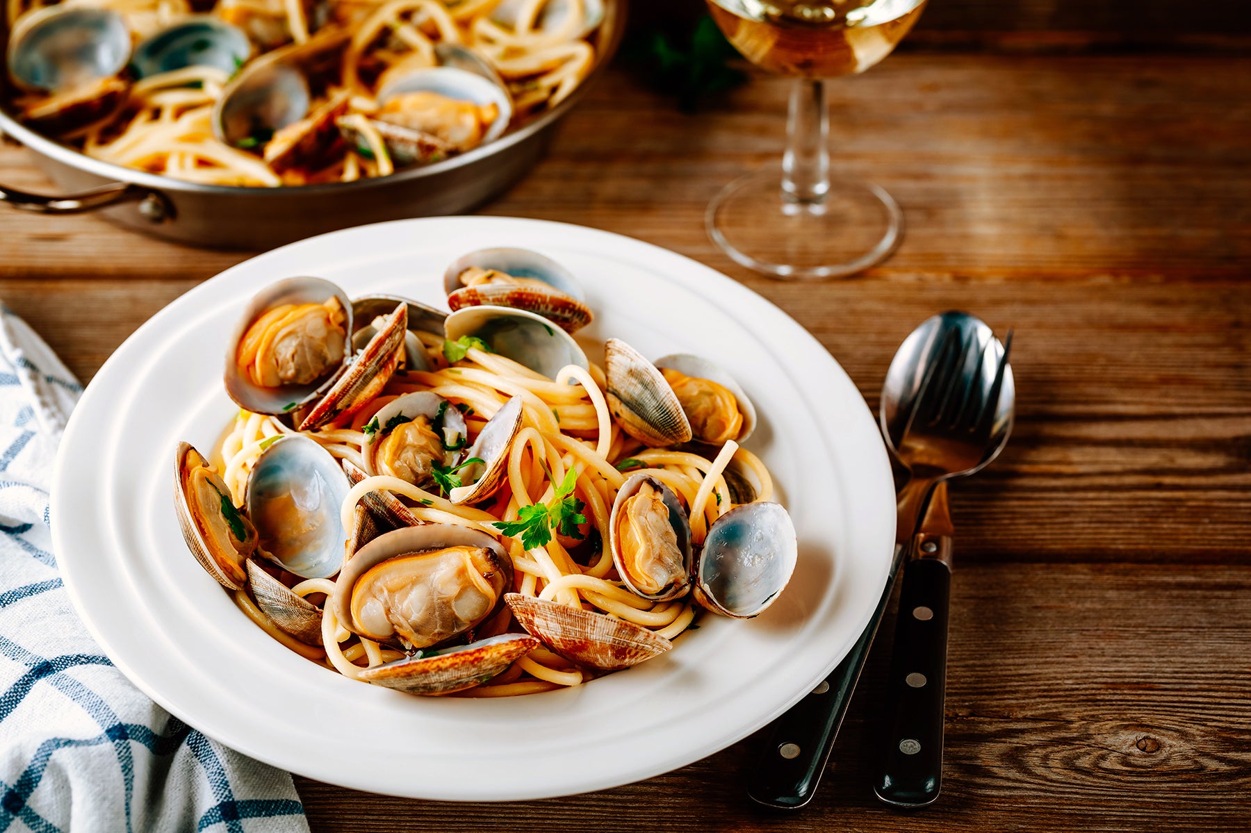 イタリア料理のキモはオリーブオイルをたっぷり使う事です。例えば、スパゲッティ・ボンゴレを作るときはオリーブオイルを一人前大さじ4-6杯も使います。あさりから出たダシを乳化させて旨味をソースに閉じ込めるためにはそのくらい必要なのです。