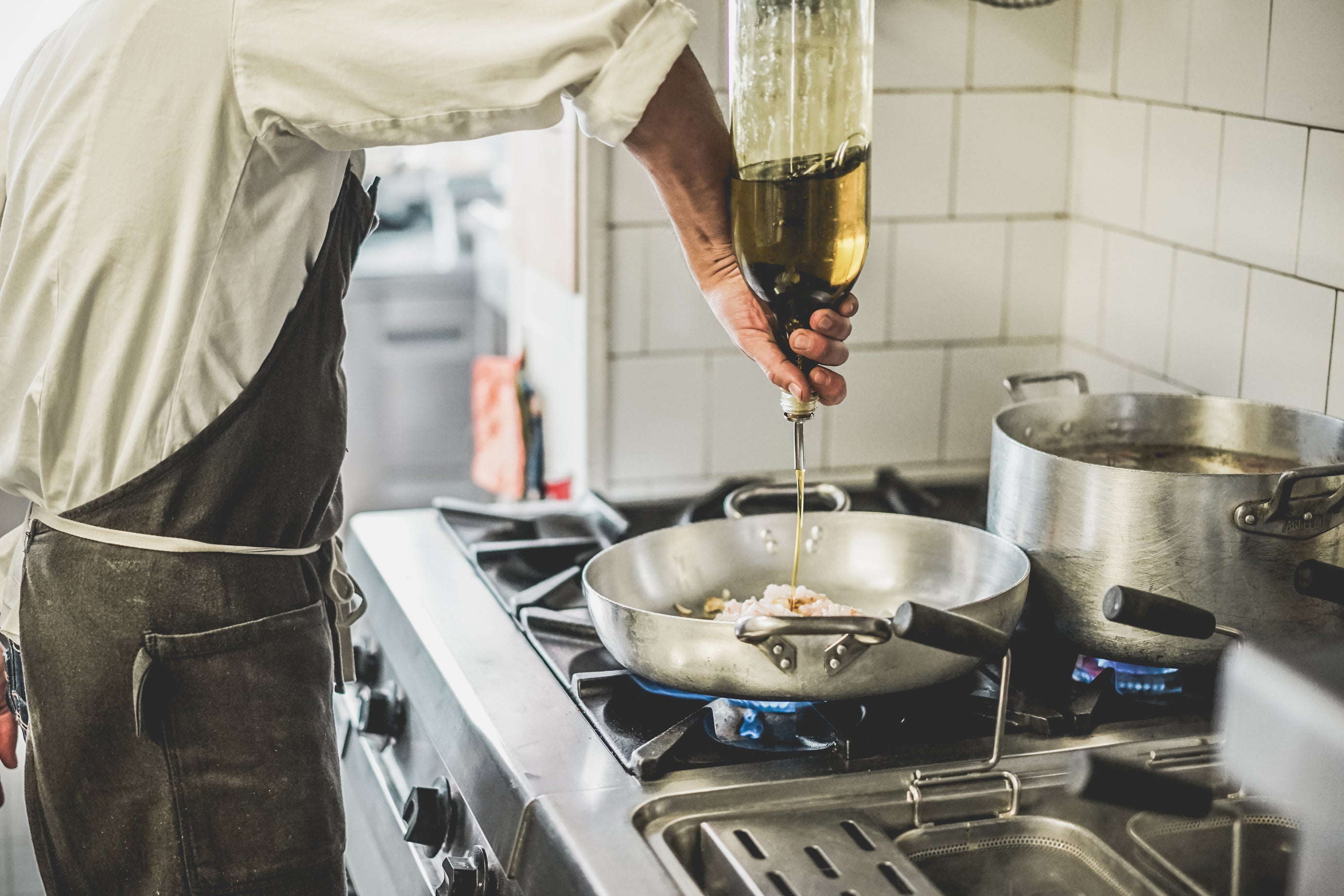 しかし、この量を高価なエキストラバージンオイルを使用していたのでは一皿がとても高価なものになってしまいます。従って調理するときに、より安価なピュアオイルを使い、最後に香りつけのため、エキストラ・バージン・オイルを少々振るという事がレストランの厨房では一般的となります。また、エキストラ・バージン・オイルの香りはかなり強いので、魚料理などでエキストラ・バージン・オイルのみを使うと、オリーブ・オイルの香りが主張し過ぎてしまうという理由もあります。従って、サラダのドレッシングや、パンにつけて使用するのはエキストラ・バージンオイル、加熱調理にはピュア・オイルと使い分けるのが一般的となります。