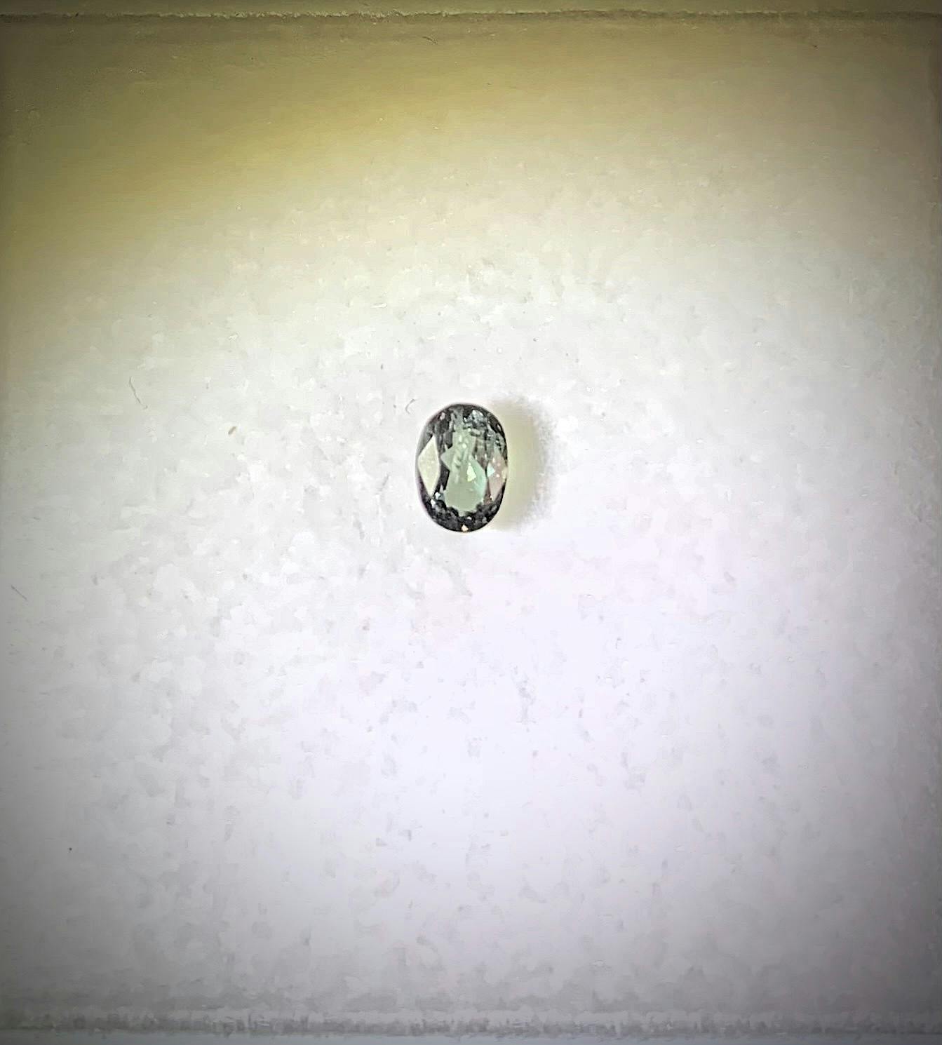 カラーチェンジガーネットの宝石言葉は、「昼と夜の愛の変貌」です。昼と夜では異なる顔を見せる愛の形という意味が込められております。このベキリーブルーと呼ばれるカラーチェンジガーネットは、蛍光灯下ではブルーグレーやブルーグリーンの色合いで、白熱灯下ではレッドやパープルに変色します。
