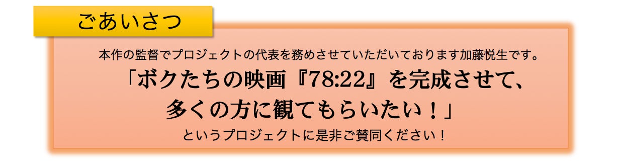 映画を創りたくて、想いを伝えたくて、居ても立ってもいられなくて集まった僕らの『78:22』を多くの人に観てもらいたい! ぜひご協力をお願いいたします!