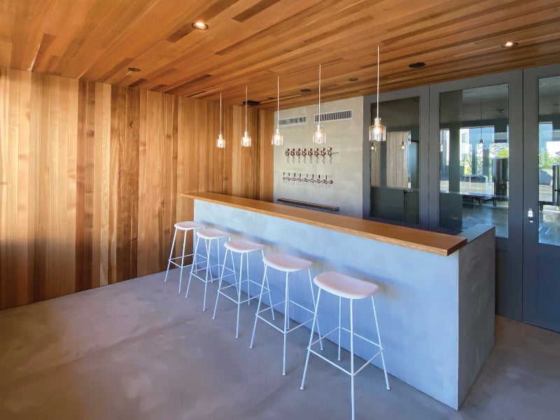 店舗はガラス越しに醸造室が見えるように設計しています。醸造設備や作業風景を見ていただけるようにしました。