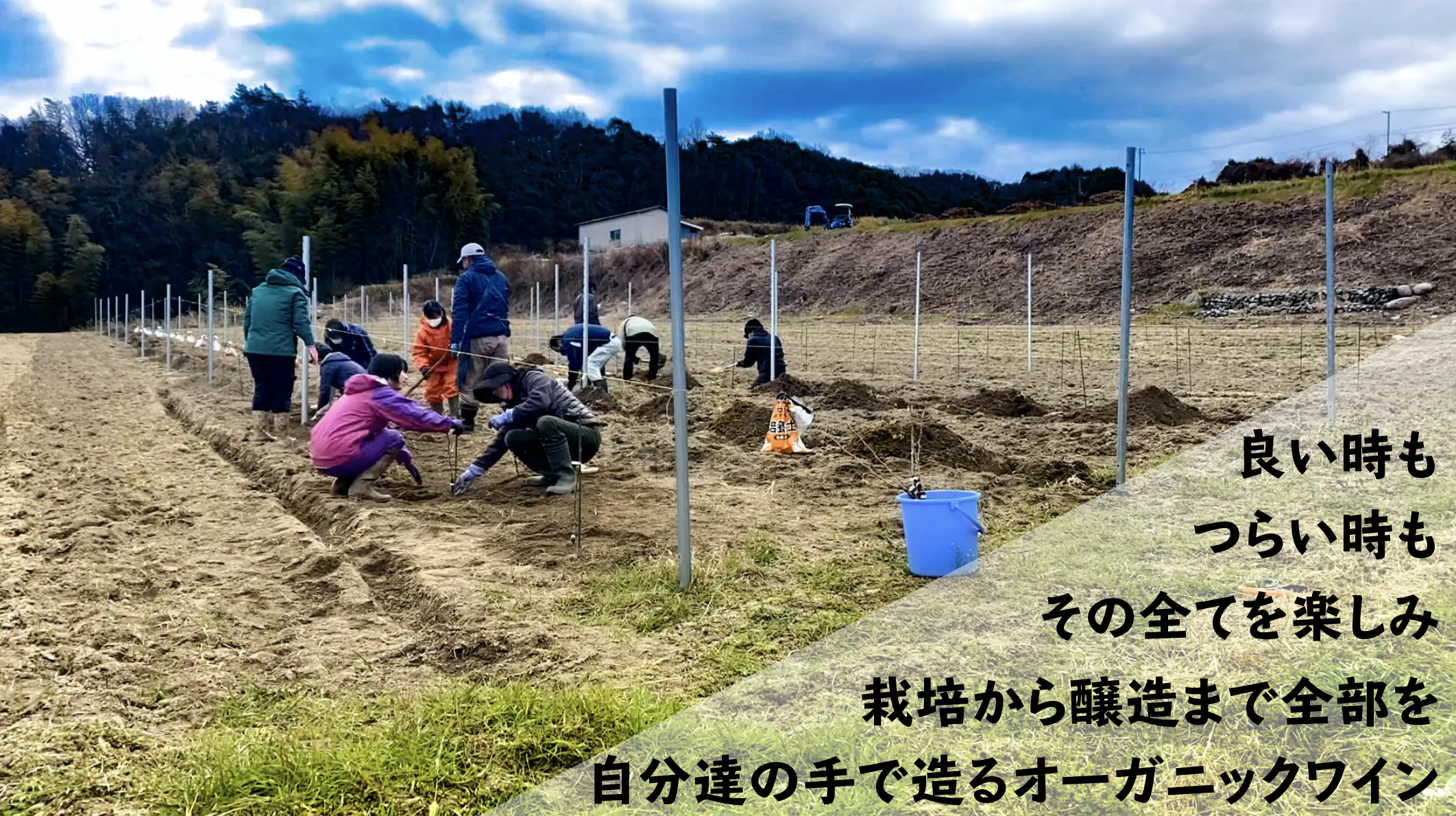 今年の2月28日にブドウ栽培を始めるにあたって出会った地域の先輩農家さんや仲間たちの助けもあり、ワイン用の葡萄品種「シャルドネ」の苗木を160本、植樹することができました。