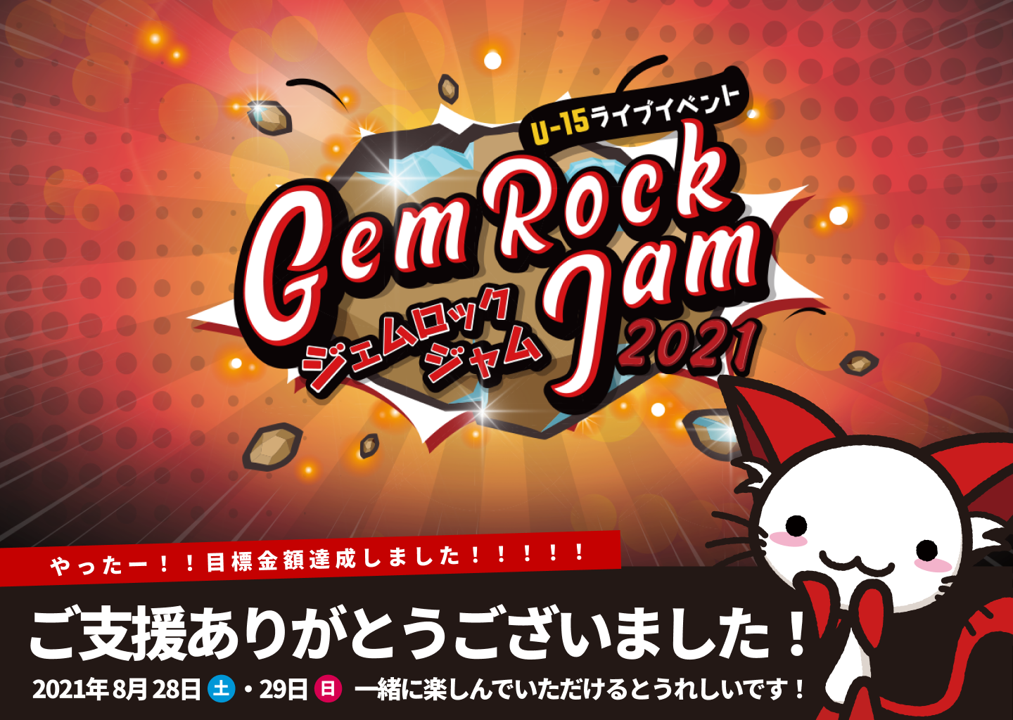 2021/08/18 17:13\ 目標金額、達成いたしました!!!! /こんにちは!株式会社ONTEKU・運営事務局広報の落合です!ジェムロックジャム、初めてのクラファンが終了いたしました!!なんとなんと!みなさま、ありがとうございました〜〜!!!ご支援いただいたみなさま、本当に、ありがとうございました〜〜〜!!!!!!!!アーティストのみんな、ファンの方々、そしてご賛同いただけた全てのみなさまに、感謝の気持ちでいっぱいです!!!!!!本当にありがとうございます!!!!!!\ 順次、お楽しみ特典映像をお送りします! /現在、運営では、ご支援いただいたみなさまに、まずは「お礼のメール」と「お楽しみ特典映像」をお届けするべく、準備を進めております!お手元にお届けできるまで、今しばらくお待ちくださいませ。GRJオリジナルグッズをご購入いただいた方は、イベント当日までにお届けできるよう進めております。当日はぜひ!グッズを手に盛り上がっていただけると嬉しいです!!!!お名前発表権があるご支援をご購入いただいた方、ロゴの掲載権があるご支援をご購入いただいた方には、運営より別途ご連絡させていただきますので、メッセージをお見逃しないよう、お願いいたします。今回、初めてのクラウドファンディングでドキドキだったのですが、みなさまと一緒に達成できたことが、ほんとにほんとに嬉しいです!!!!!何度も重ねて言っちゃうのですが、本当にありがとうございました!!!!!!!!ジェムロックジャム当日に、Youtubeの画面で一緒に盛り上がれることを、楽しみにしております!!!!以上、本日の活動報告でした!ーーーーー「ジェムロックジャム」の情報は、Twitter・Facebookでも更新中!15歳以下のアーティストが集結する「ジェムロックジャム」は、8月28日(土)・29日(日)の2日に渡って、YouTube生配信でお届けします!Twitter・Facebookでは、毎日お知らせを更新していますので、ぜひそちらもチェックしてみてくださいね!それでは、引き続きどうぞよろしくお願いいたします!! もっと見る